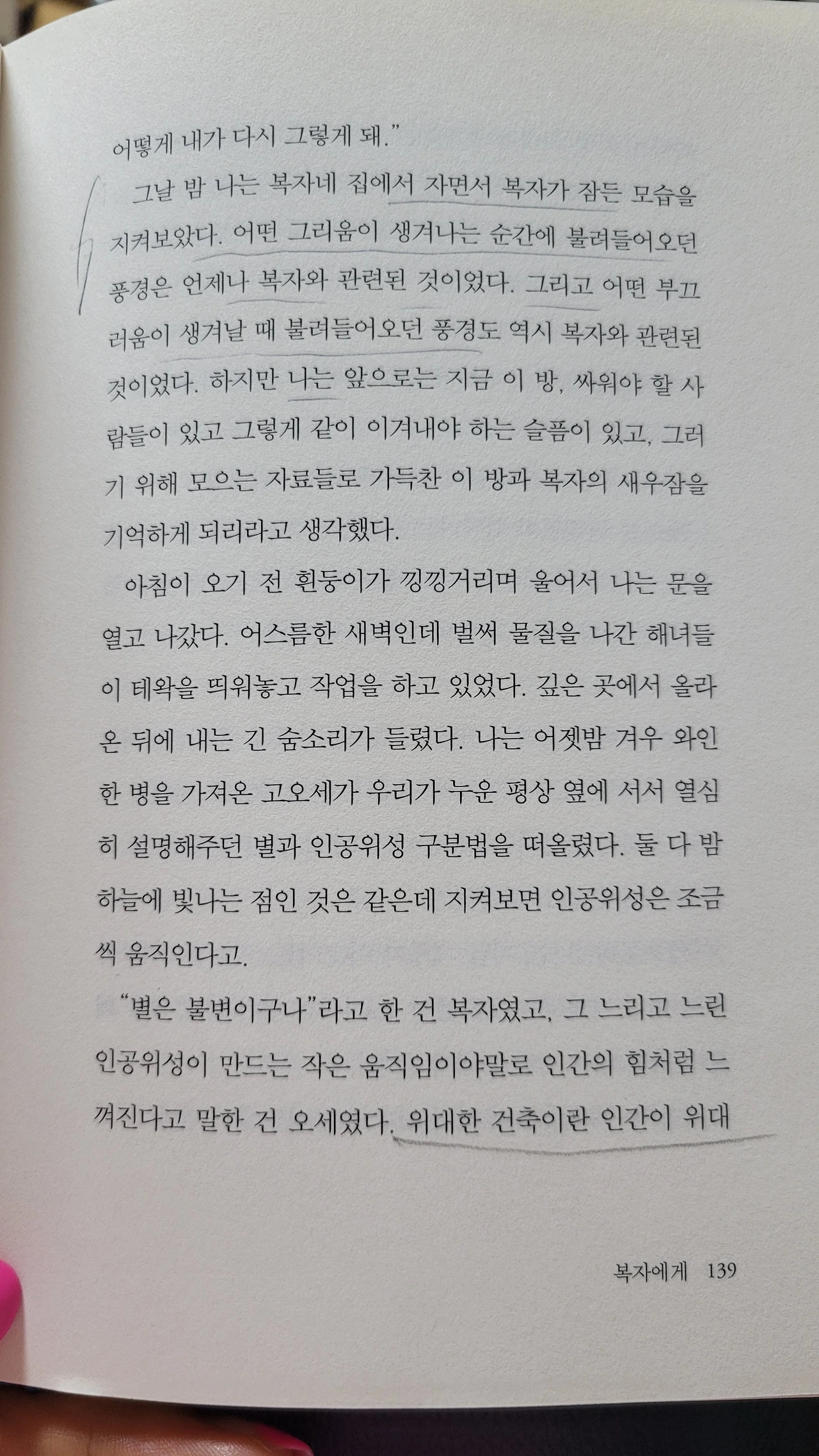 필사하고픈 문장들이 굴비처럼 엮였다. 이런 문장들이 책 사이사이에 숨어 있겠지. 나는 행복한 술래다. '무궁화 꽃이 피었습니다'는 생략, '못 찾겠다 꾀꼬리'도 다음에. 오늘 안에 다 찾을 수 있을 만큼, 난 지금 이 책에 완전 몰입.