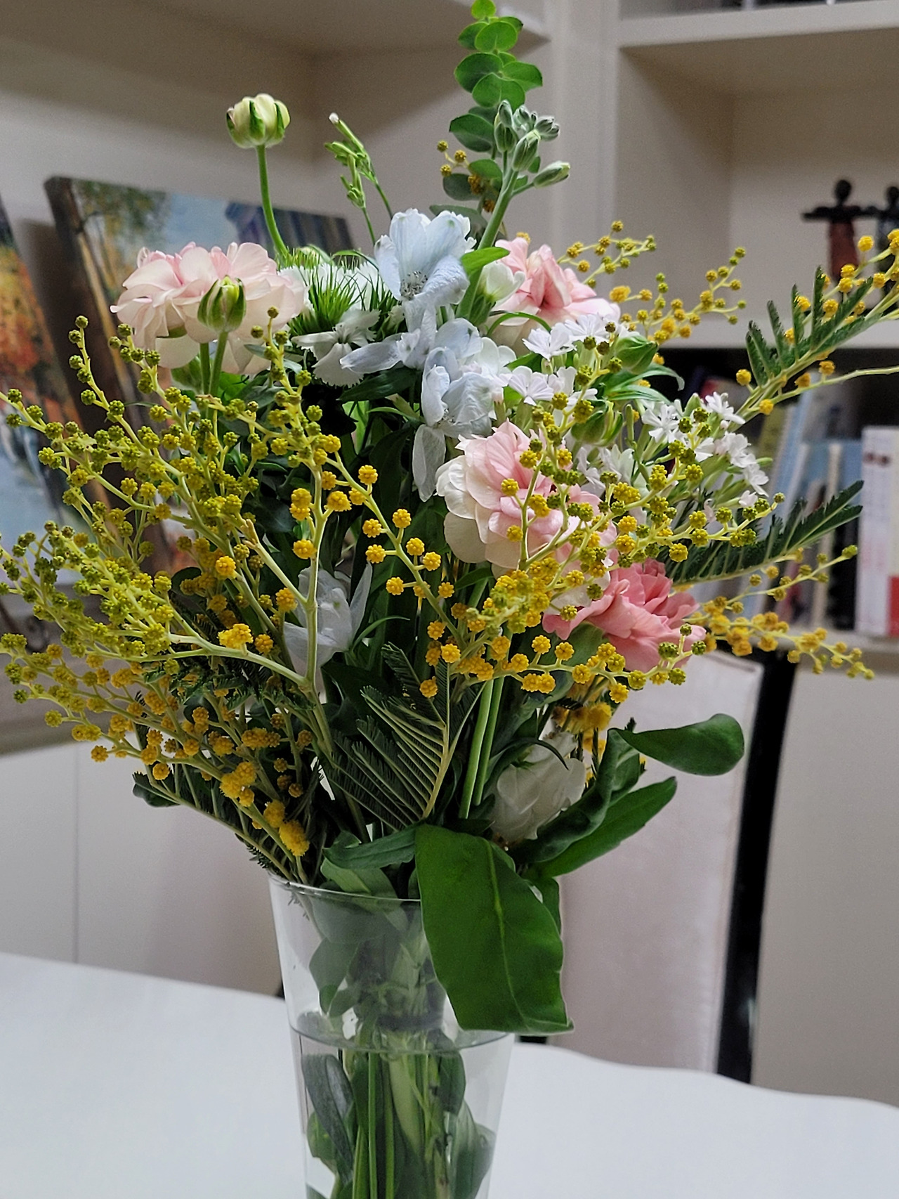비닐 포장을 벗기고, 투명한 유리병에 꽃을 꽂는다. 미모자와 어우러진 꽃들로 집안이 환하다. 나는 모든 일을 뒤로 미루고 가만히 식탁 의자에 앉아 꽃을 본다. 꽃들이 향기를 조금씩 내뿜기 시작한다. 그 향기가 내게로 와 머무는 시간, 나는 ‘꽃멍 놀이’에 빠진다.