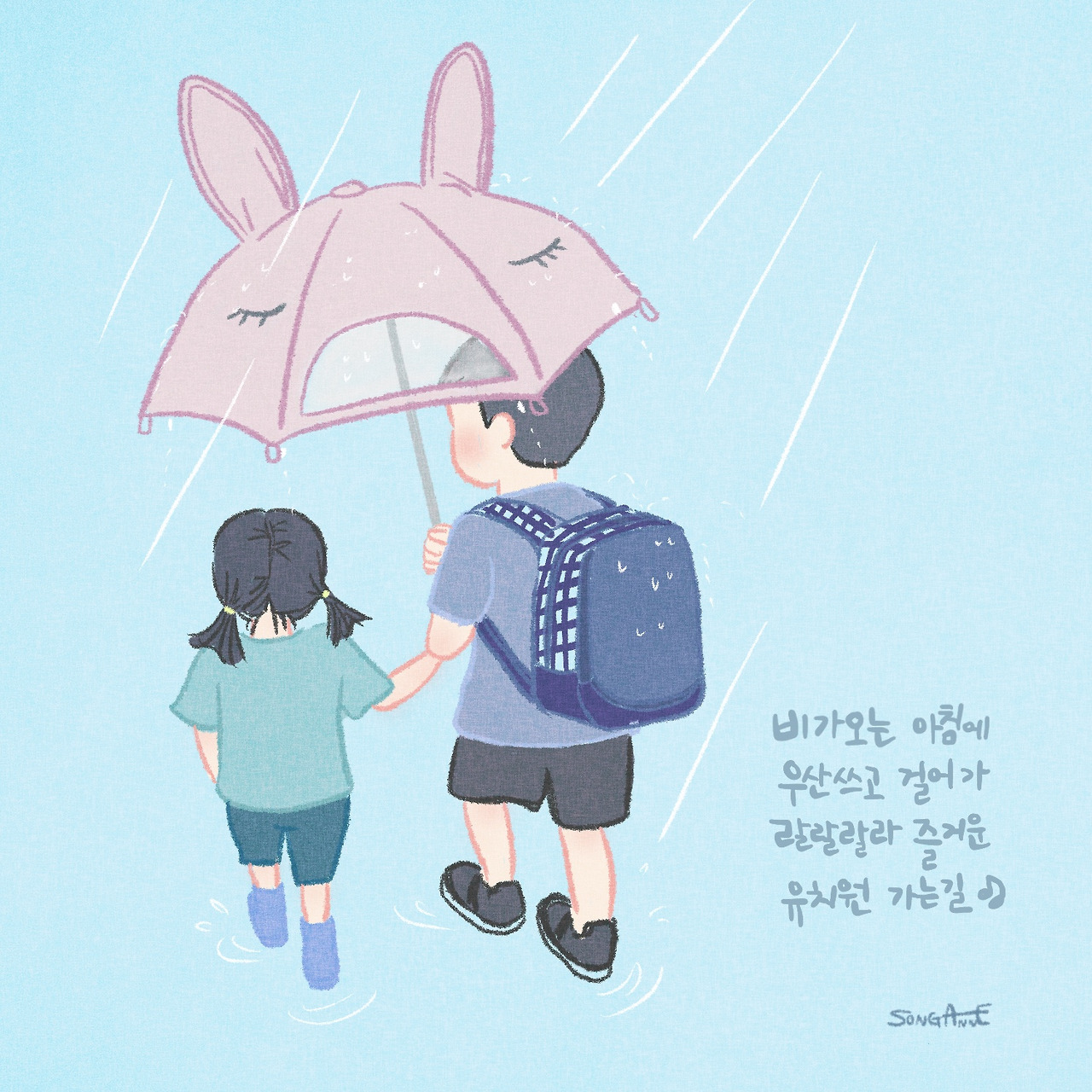 비가 오는 아침에우산 쓰고 걸어가랄랄랄라 즐거운 유치원 가는 길~ ♬