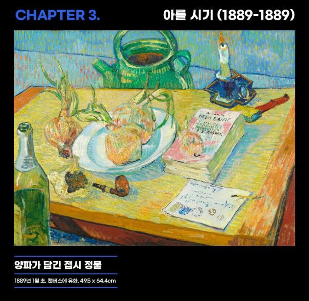 고흐는 고생이 그저 고흐의 동생 테오의 화랑에서 본인의 그림을 팔기 위해 고흐에게 왔지만 고흐는 생각이 달랐다 그렇게 둘은 같이 살기 시작되었지만 둘의 그림스타일은 너무 달랐고 성격도 달랐다 그래서 고흐와 고갱은 다투다 고갱은 떠나고 고흐는 방향성을 잃어버리고 자신의 왼쪽 귀를 자르고 그는 아를의 병원에 입원하여 1889년 1월 7일에 퇴원한다 그날 고흐는 테오에게 다시 그림을 그릴 준비를 하기 위해 두 개의 정물화 작업을 할 것이라고 편지를 쓴다 그리고 그중 하나는 이 정물화입니다 이 그림은 고흐가 평소 사용하던 물건들을 그림으로서 다시 일상으로 돌아왔다는 걸 나타낸다 또한 고흐는 그의 특유의 강렬한 붓 터치로 양파조차도 생동감 있게 그렸으며 노란 배경과 푸르스름한 색감이 조화를 이루며 보는 사람들에게 따뜻한 느낌마저 전달한다.