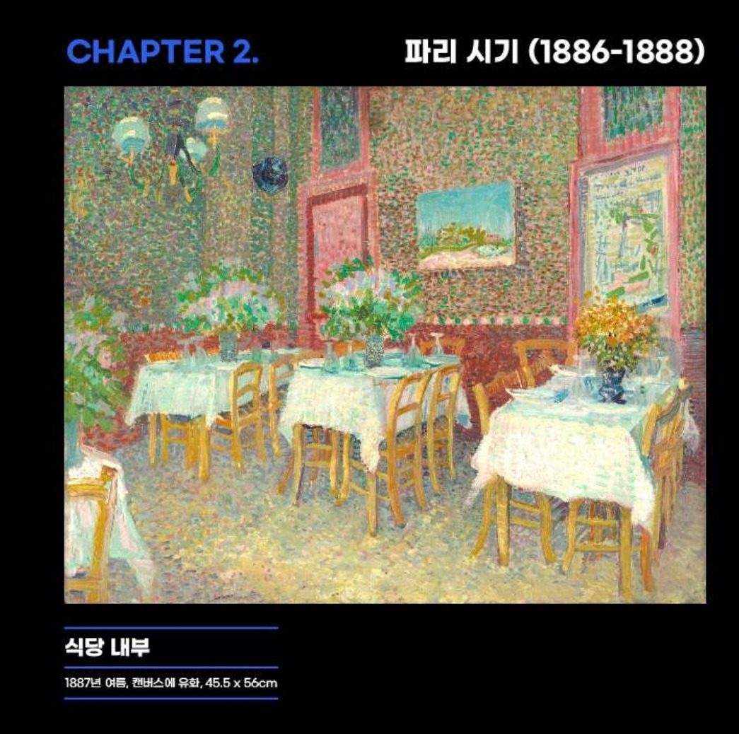 예술가들은 이런 식당 같은 곳에서 교류를 했다고 한다 하지만 예술가들은 보통 돈이 없었기에 이런 식당보다는 카페에서 교류를 많이 했다 요즘 생각하는 노트북 들고 들어가는 조용한 카페가 아닌 예전의 카페는 낮에는 음식을 팔고 저녁에는 압생트를 파는 가게를 카페라 불렀다 고흐는 이런 곳에서 인상주의 예술가들과 교류를 많이 하며 그들의 영향을 받았고 점묘법을 응용하였다 고흐는 항상 영향받은 것들을 그대로 본인의 그림에 사용하지 않고 자신만의 방법으로 변형하여 사용한다 다른 곳은 다 점묘법으로 그림을 그린 반면 테이블과 의자는 점묘법을 사용하지 않고 사실주의에서 유래한 그러데이션 또한 주었다