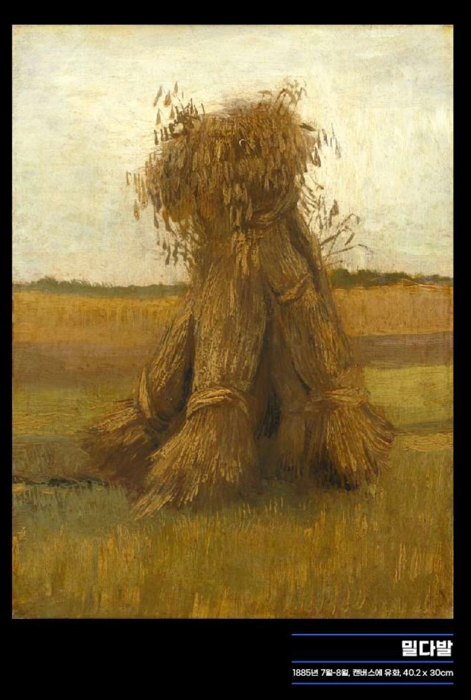 밀다발은 시골 농촌에서 볼 수 있는 아주 평범한 풍경이다 그런데 이 평범한 밀다발에 어떤 의미가 담겨 있다 그 의미는 계절에 따라 변화하는 농사의 표현은 고흐에게 중요한 현대 미술의 주제이자 본질이다, 1995년 7월과 8월에 그는 밀 수확을 그리는데 이 작품들은 나중에 아를과 생 레미에서 황급 빛 밀밭 작품에 큰 영향을 준다, 이 밀다발은 기본적으로 그림의 구도부터가 강한 충격인데 반고흐 작품에서 특별한 의미를 지닌 작품이라고 할 수 있다 먼저 정 중앙에 위치한 외로운 밀 다발이 있는데 다른 작품들에서 밀다발을 표현할 때는 밀다발들이 줄지어 서있거나 여러 줄로 배열되어 있는데 이 밀다발은 정 중앙에 위치한 관계로 우리의 시야를 중앙으로 모이게 만든다 이러한 이유로 균형 잡힌 전통적인 구도에서 살짝 벗어나는 고흐의 과감함을 시도하는 작품이라고 할 수 있다 또한 이러한 시도 덕분에 고흐의 전성기 작품에 큰 영향을 끼치는 계기가 된다.