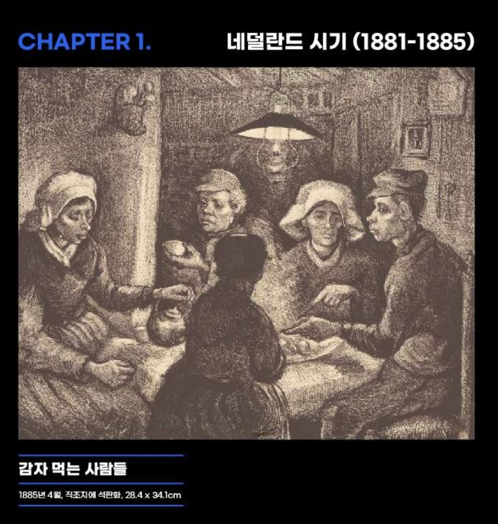 이 그림은 네덜란드 누넨에서 작업했던 작품이다, 이 감자 먹는 사람들은 고흐의 초기 시기에 가장 중요한 작품 중 하나인데 1883년에 에인트호번 근처의 작은 마을에 거주하게 된 후 현지 농촌 주민들의 삶을 묘사하고 자신의 도덕적이고 사회적 견해를 전달했다 또한 네덜란드 기후 또한 음산했던 점도 이 그림에 잘 나타나 있다 1885년 4월 말 고흐는 동생 테오에게 이렇게 편지를 쓴다 "사랑하는 테오야 난 요즘 램프 불빛 아래 감자를 먹고 있는 사람들을 그리는데 집중하고 있어 어두운 빛 아래의 가난한 감자 먹는 사람들이 그릇에 담긴 손을 그리며 그들이 평소 땅을 파고 있다는 점을 강조하려고 했어 그래서 그것은 육체노동을 말하고자 한 것이고 그들이 정직하게 먹고산다는 것을 보여주고 싶어 나는 우리들과는 전혀 다른 가난함이지만 정직한 삶의 방식을 표현해 주고 싶은 거야 그렇기 때문에 난 다른 사람들이 내 표현방식을 곧바로 좋아하는 것을 기대하진 않아" 그리고 그가 캔버스에 첫 번째 감자 먹는 사람들을 완성한 후 같은 주제로 석판화를 그리기로 결심하고 단 하루 만에 기억을 통해 석판에 옮겼고 초기에 그렸던 드로잉을 사용하지 않았기 때문에 판화에 인쇄된 그림에서는 인물들이 반전되어 나타납니다, 이 작품에서는 고흐는 그의 우상이었던 렘브란트의 트레이드 마크라고 할 수 있는 빛의 표현과 강렬한 명암의 표현 방식을 표현한 점도 그의 초창기 작품의 특징을 보여준다, 고흐는 친구들과 제자들에게 선물로 주기 위해 20장의 석판화 에디션을 인쇄했는데 그 석판화들은 판매용이 아니고 전적으로 개인적인 그림이라고 동생에게 편지로 썼다