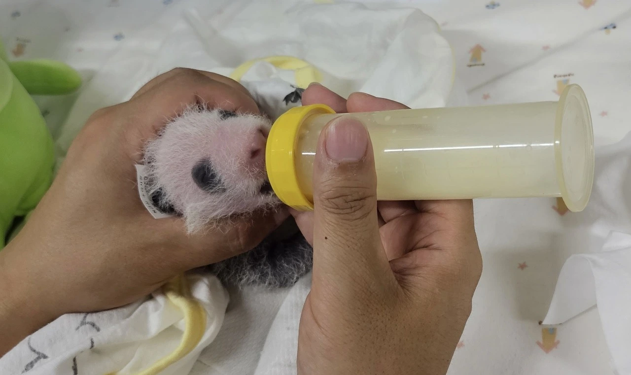 또 아기 판다의 체온을 보호하기 위해 양손과 온몸으로 아기를 감싸던 자세에서 벗어나한 손으로 아기를 받치고 다른 한 손으로 댓잎을 잡고 먹기 시작했지요.먹는 양도 조금씩 늘고 있어 이에 맞추어 배변량도 늘고 있습니다.때문에 저희는 산실의 청결 관리에 더욱 신경을 쓰고 있답니다.