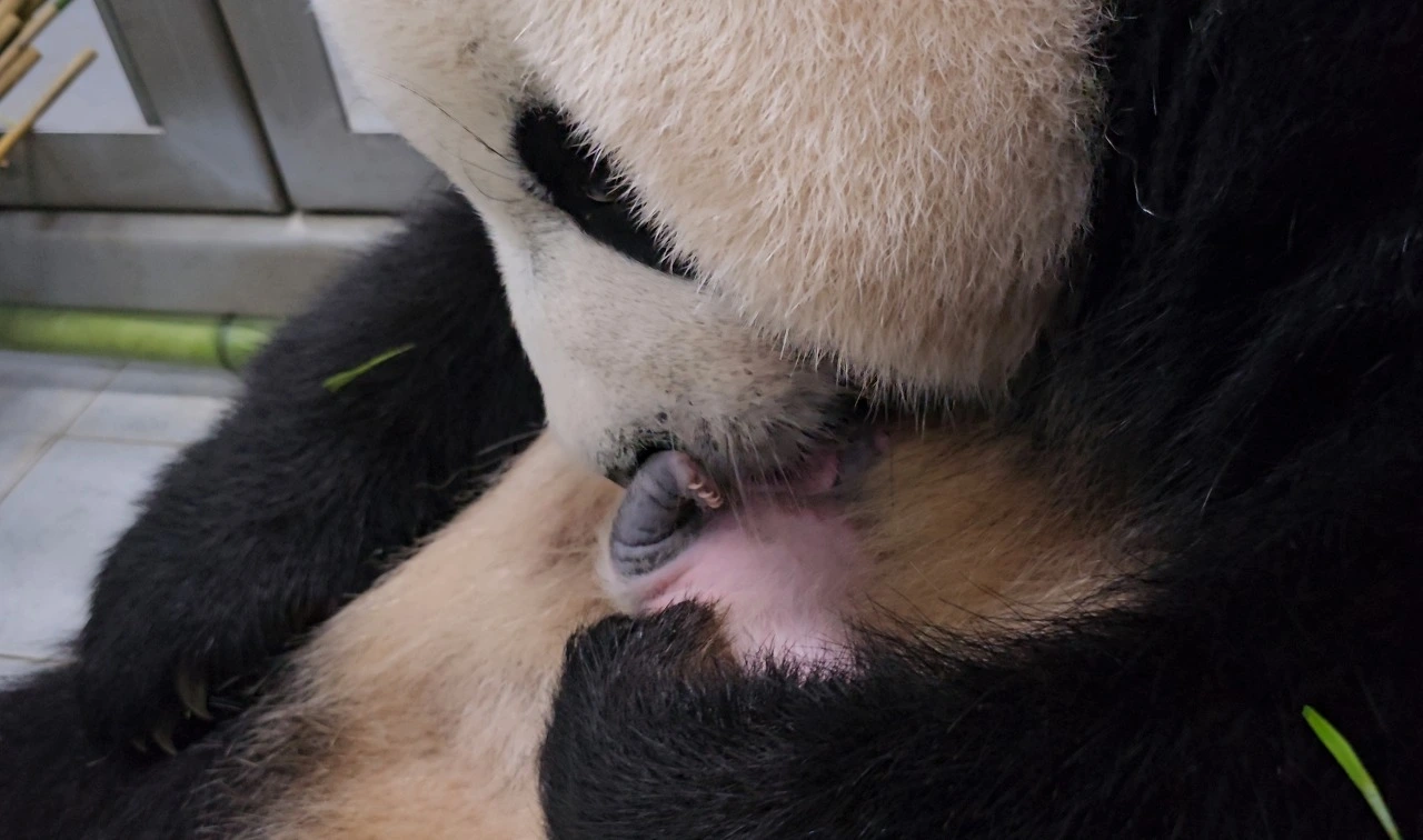 아기 판다를 핥아주는 '아이바오'