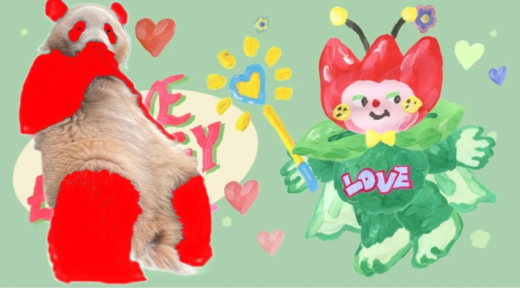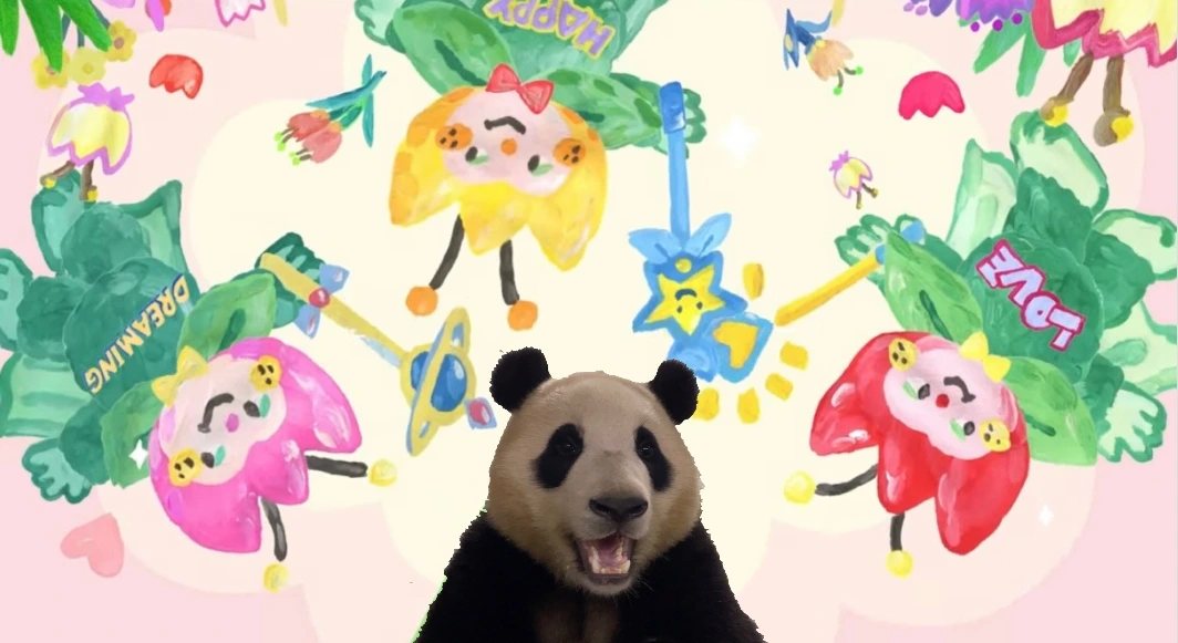 마지막으로 빨간 튤립 요정이 요술봉으로 푸바오의 털옷 색깔을 바꿔 주었습니다.