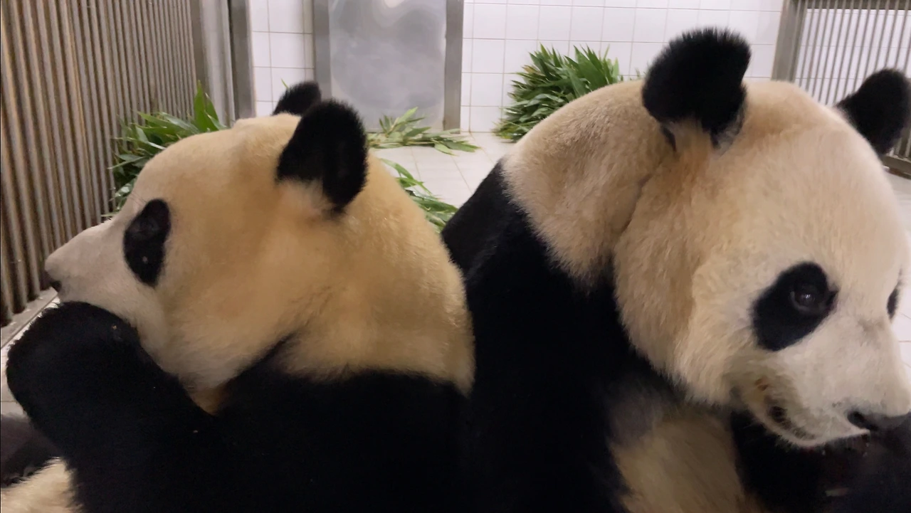 어느 날 워터우를 열심히 먹던 푸바오는 자신과 엄마가 똑같이 입고 있는 깜장 털옷을 보고 문득 생각이 들었습니다.