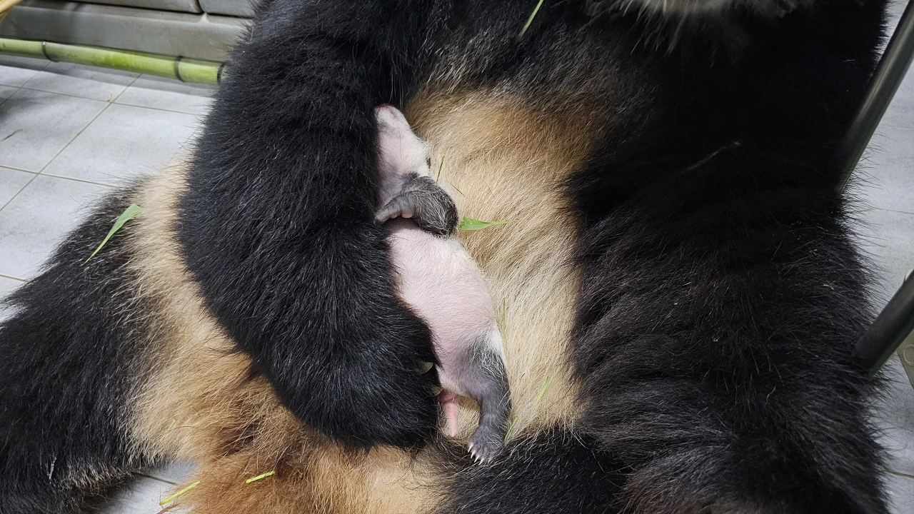 엄마 품에 안겨 자는 아기 판다