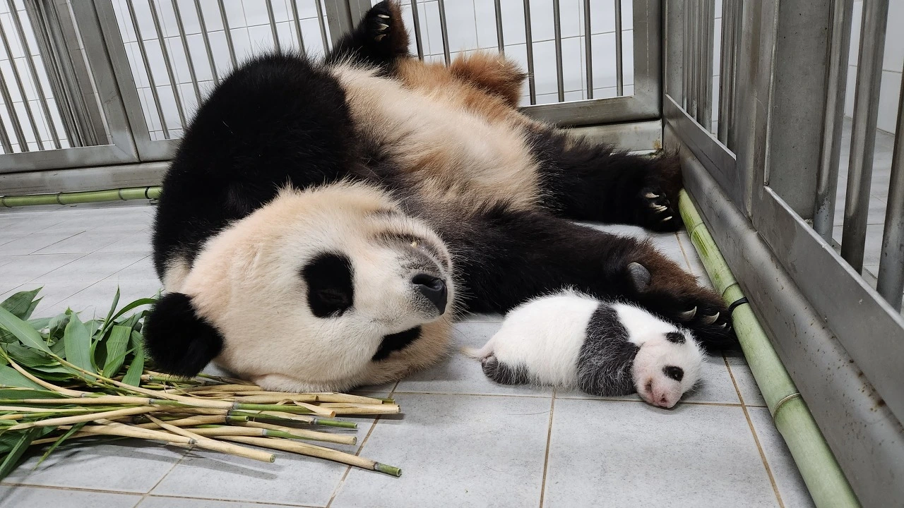 이제는 쌍둥이가 스스로 체온을 조절할 수 있는 능력이 생겼습니다.이에 따라 아이바오도 배변과 물을 먹을 때아기판다를 바닥에 내려놓고 이동합니다.품에 안고 있을 때도 아기판다의 몸 전체가 활짝 개방되고신체가 바닥에 닿아 있는 시간도 늘어나고 있습니다.