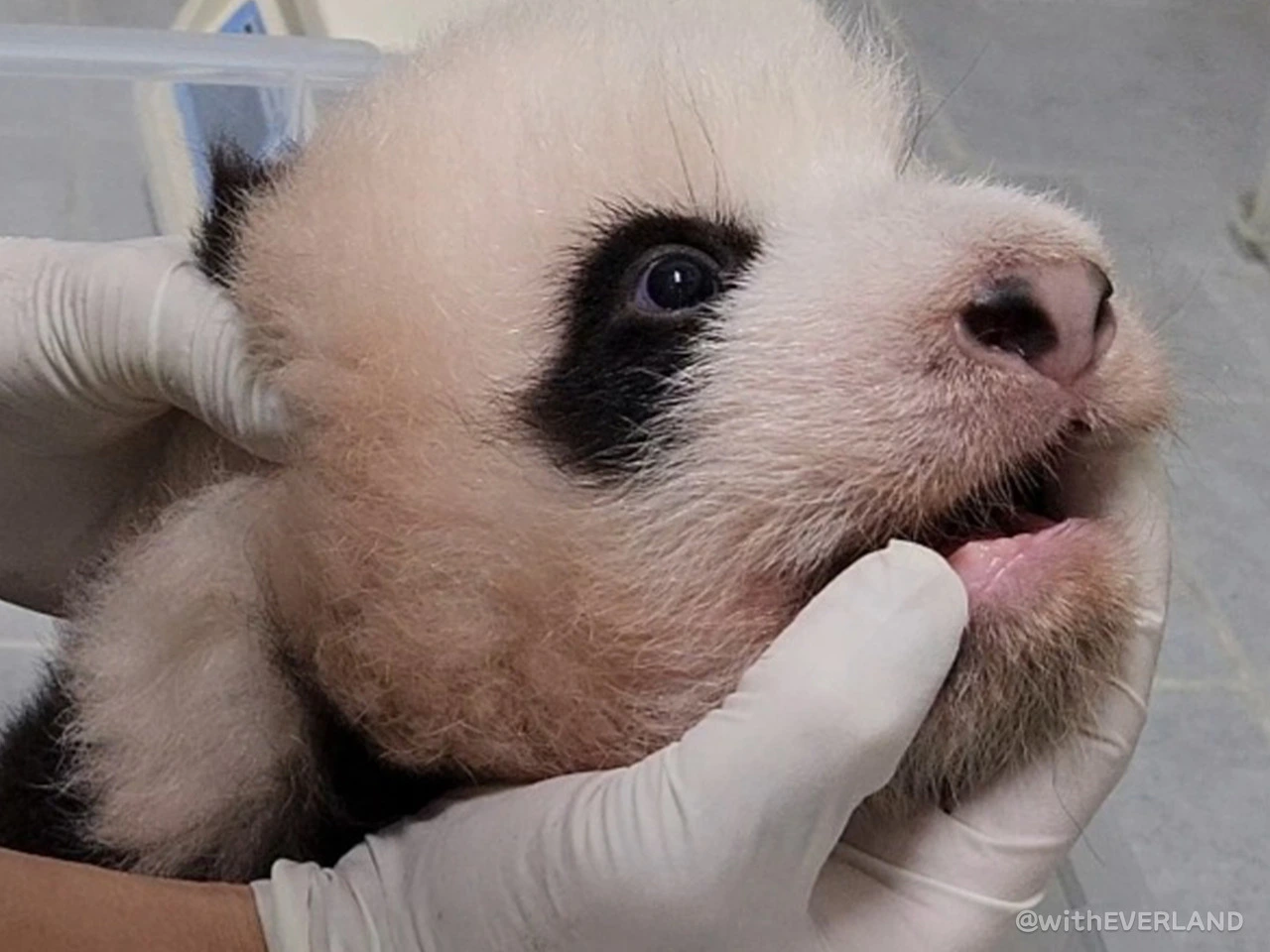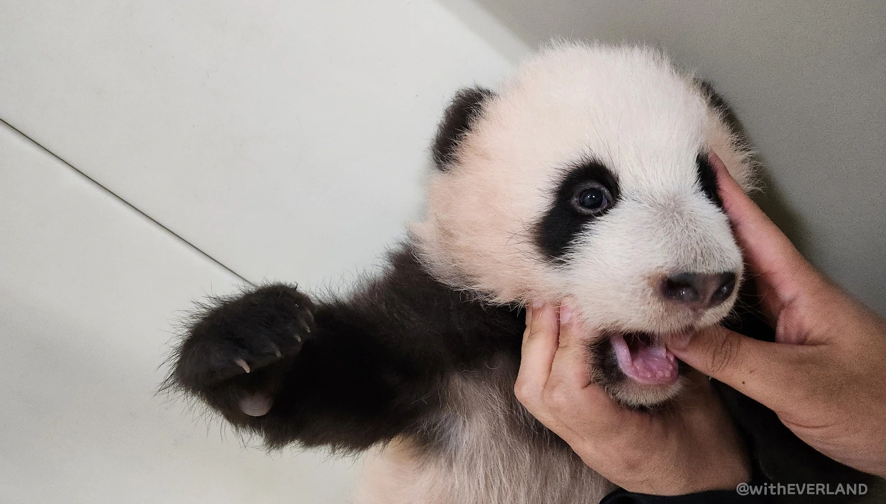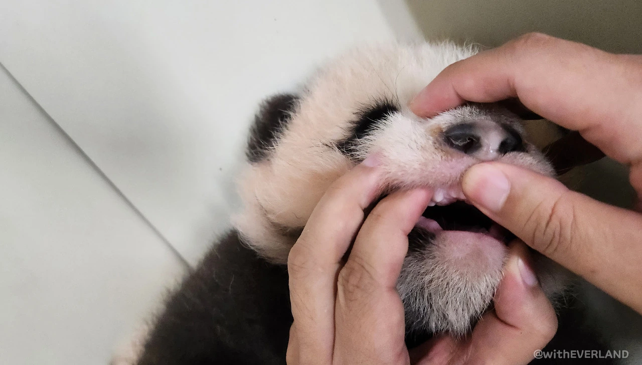 매일 쌍둥이의 유치가 얼마나 자랐는지 확인하고 있습니다.이는 아기 판다의 치아 성장을 확인하는 매우 중요한 일인데요.그래서 확인 전에는 항상 철저한 손 소독과, 심쿵 방지를 위한 심호흡을 진행하고 있습니다.^^*