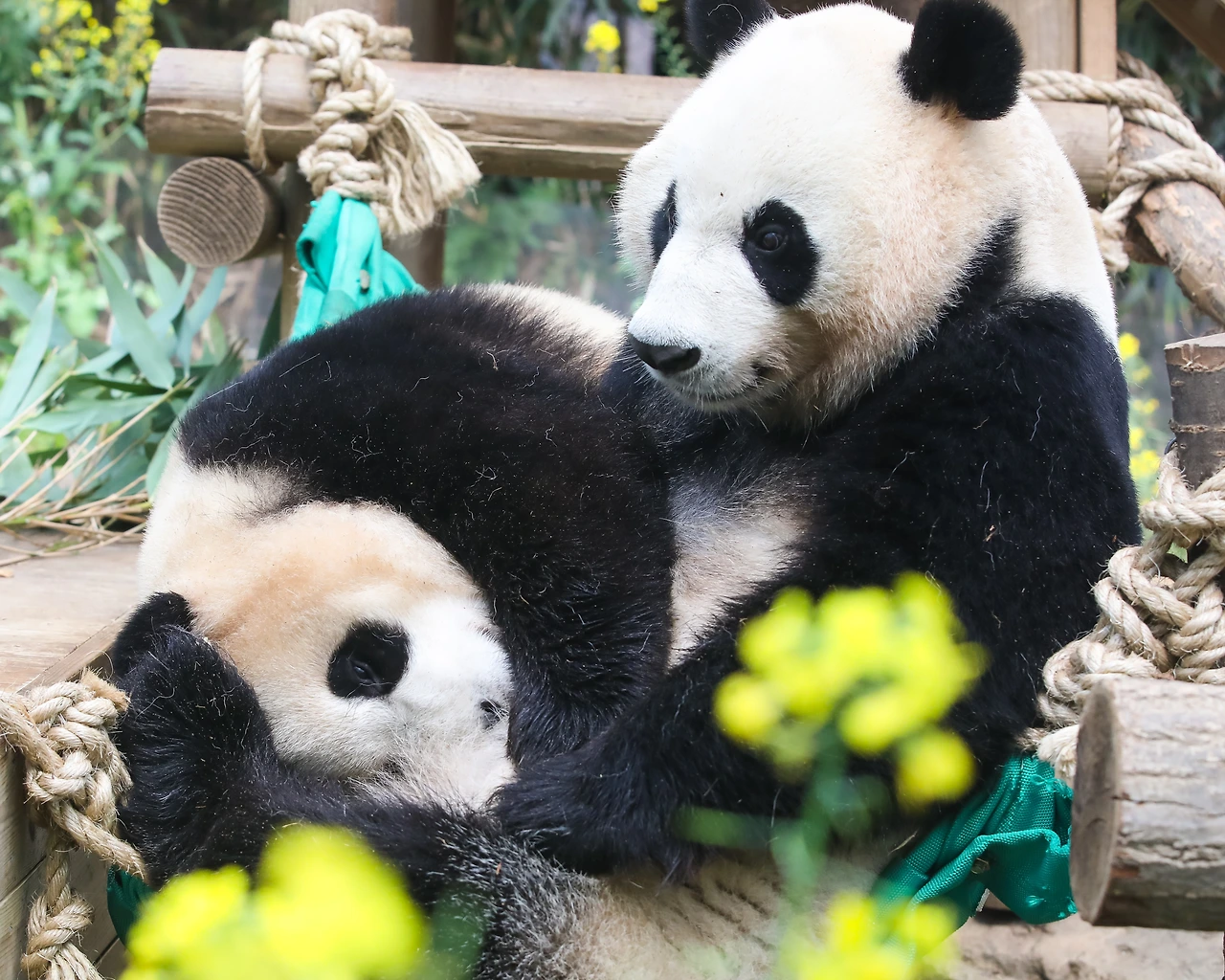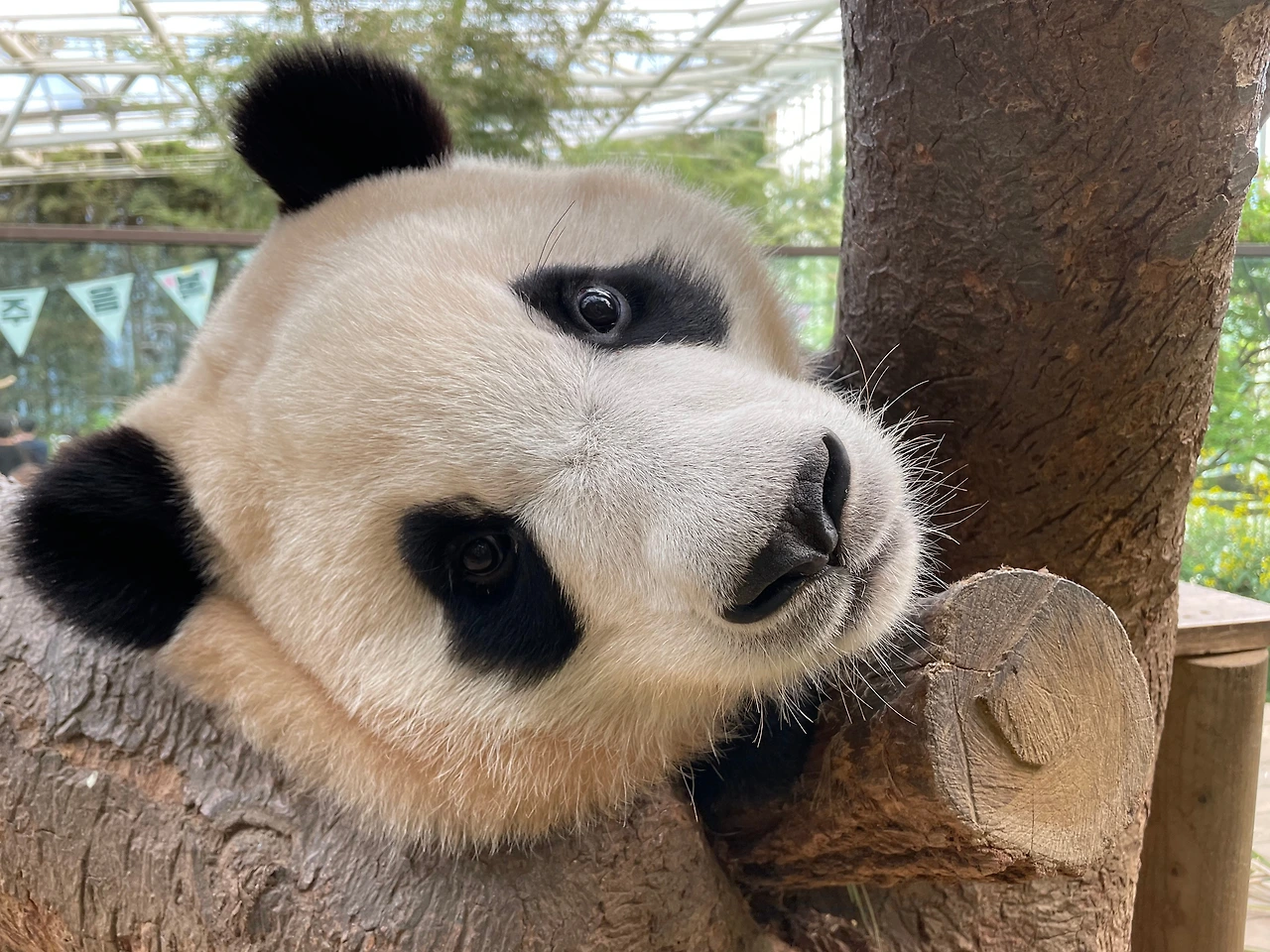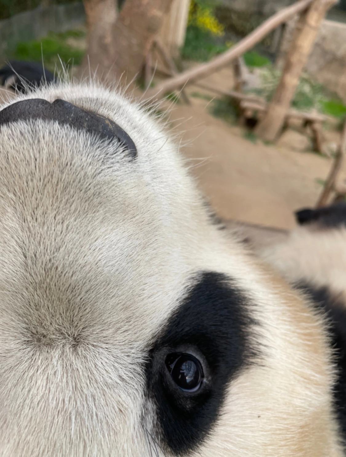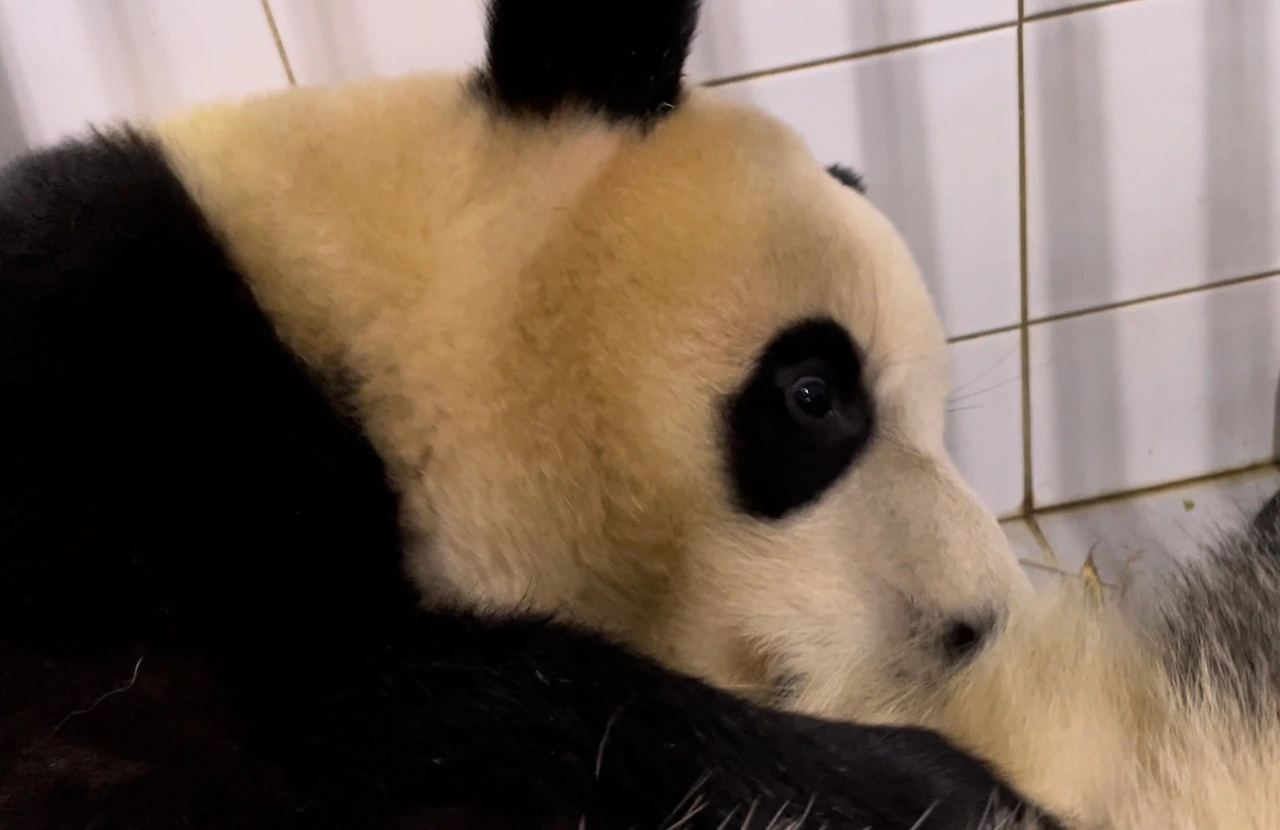 푸바오는 그때서야 엄마를 찾아 주변을 두리번거렸어요. 그런데 멀리 사라져 버렸을 것만 같던 엄마 ‘아이바오’는 푸바오의 바로 머리 위에서 자신의 젖을 먹고 있는 푸바오를 지긋이 내려다보고 있었어요.