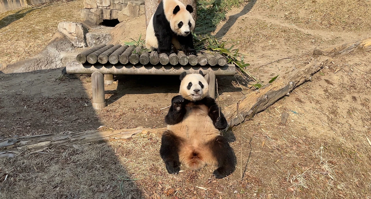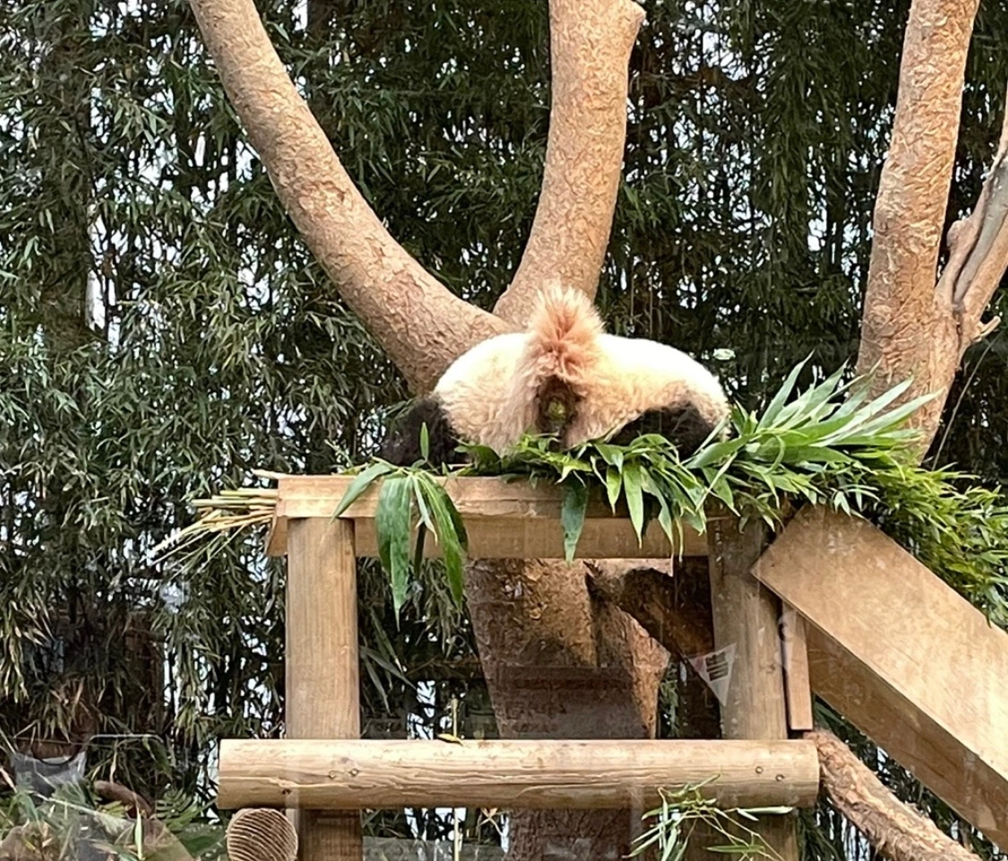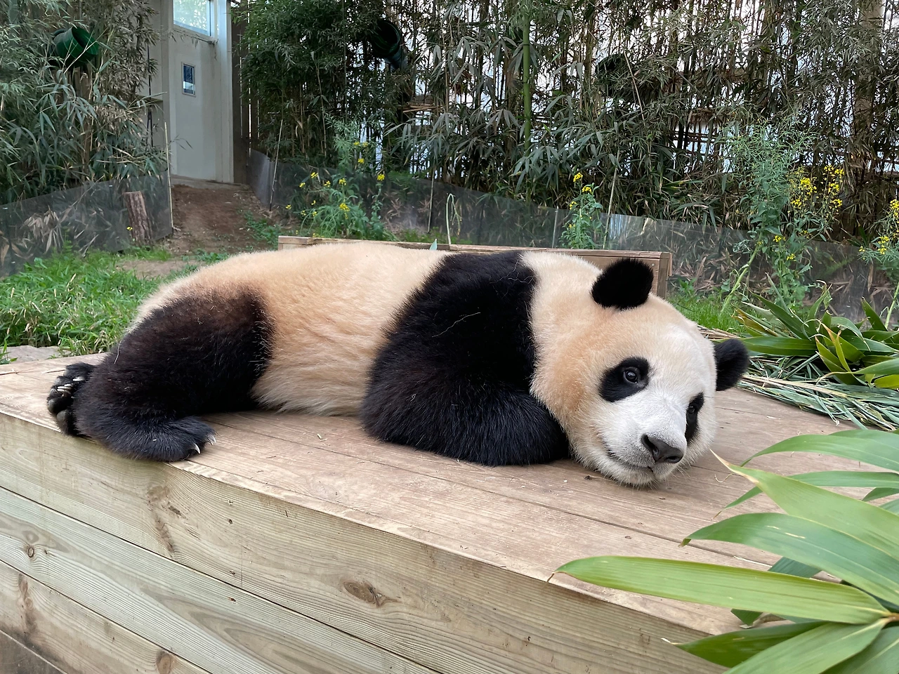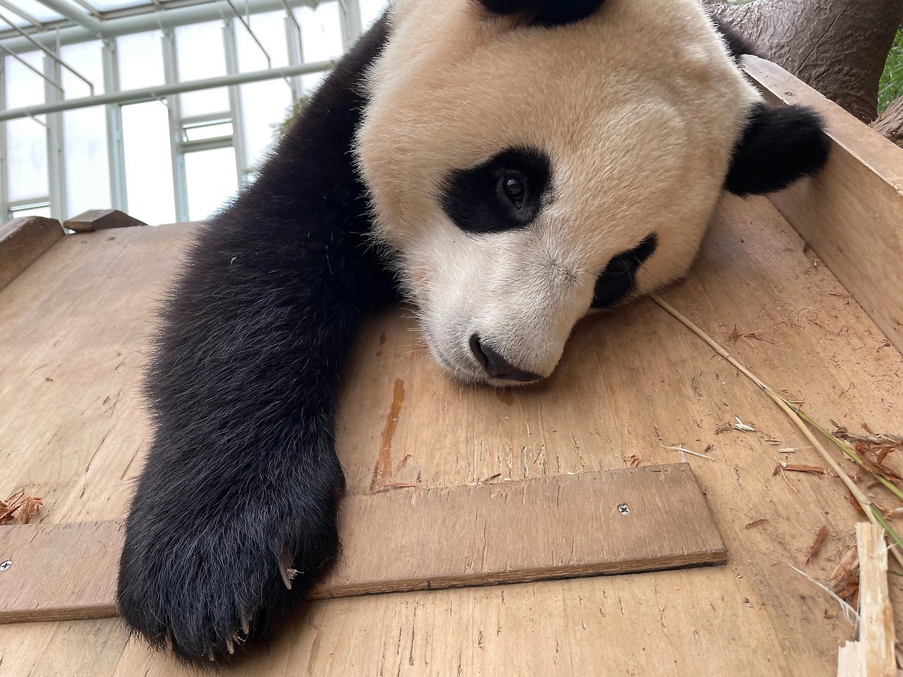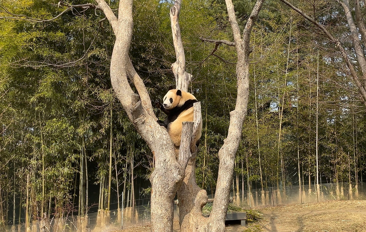 푸바오는 야외에서 상쾌한 공기를 마시고 운동을 하면서도 고민했어요.