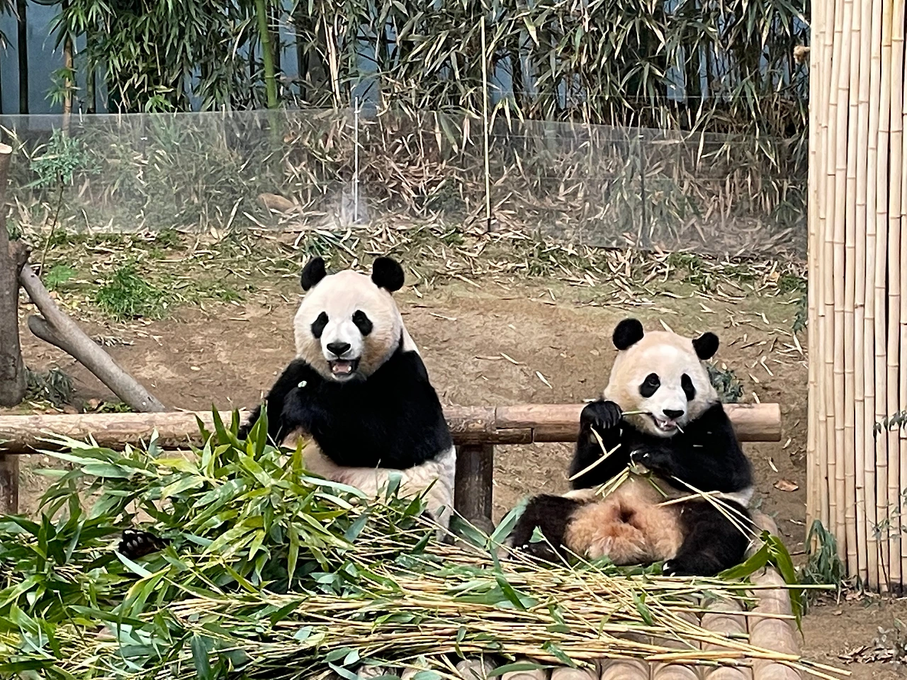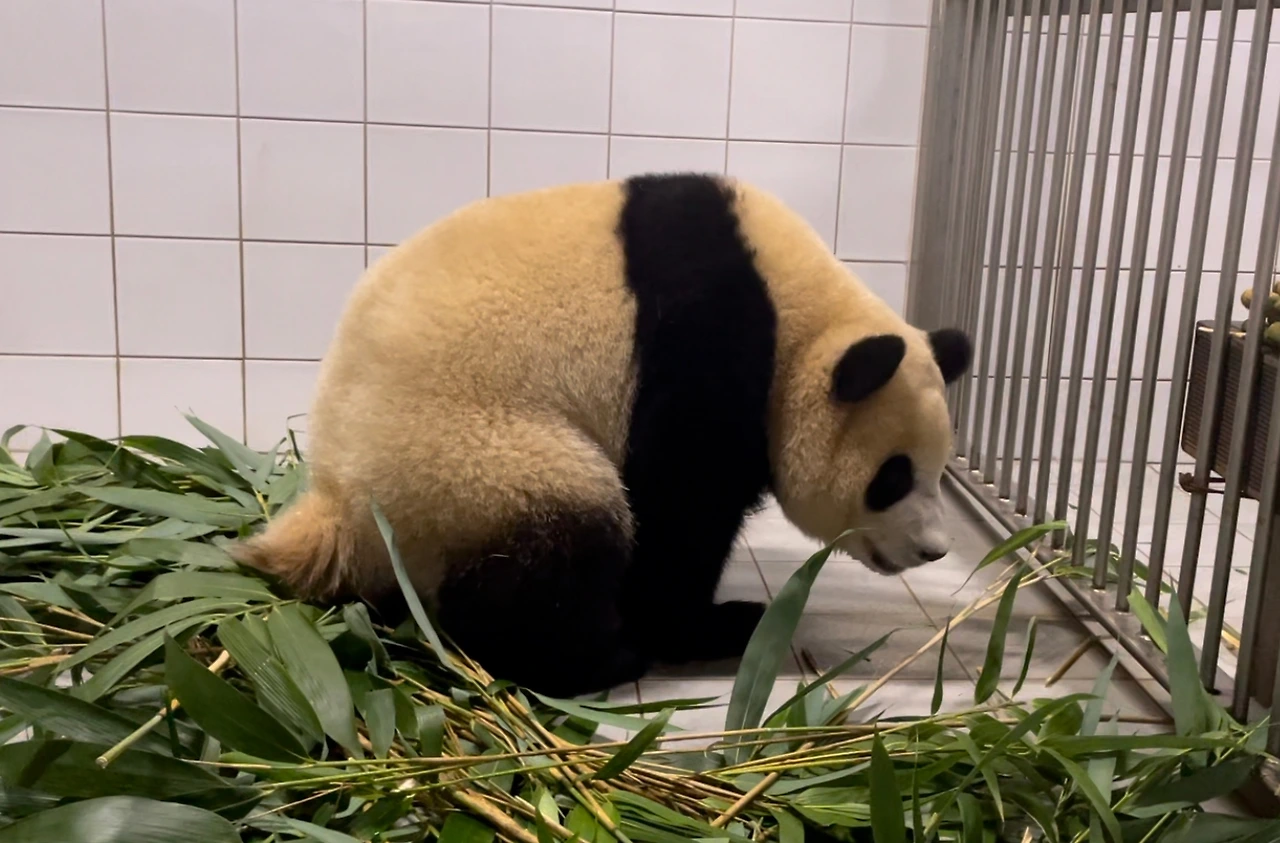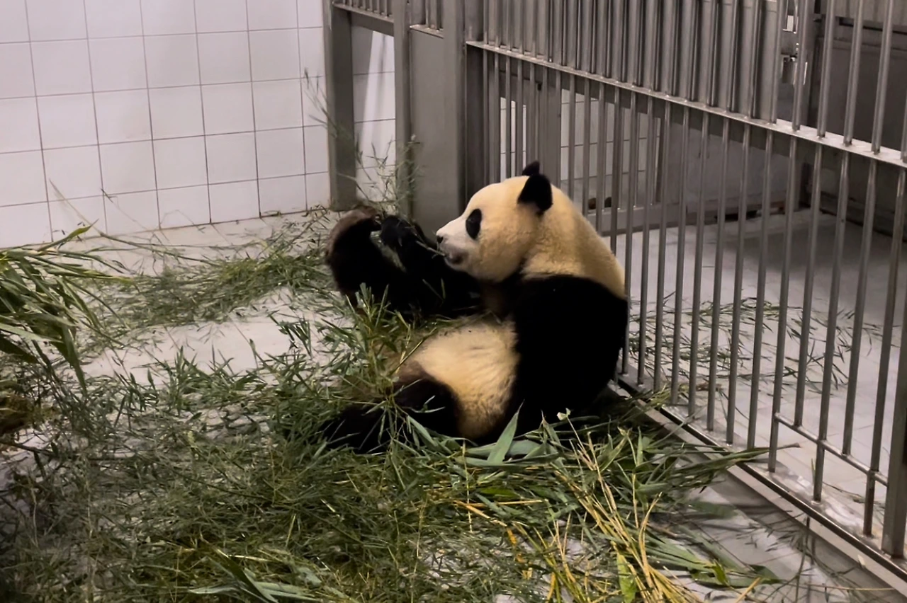 다시 엄마와 함께 실내로 들어와 대나무 먹기