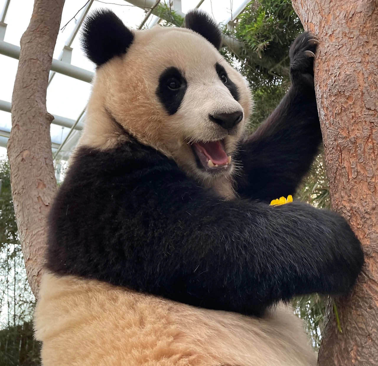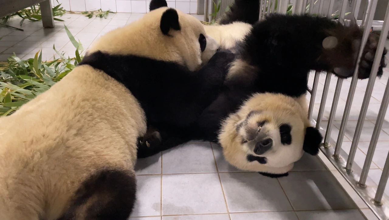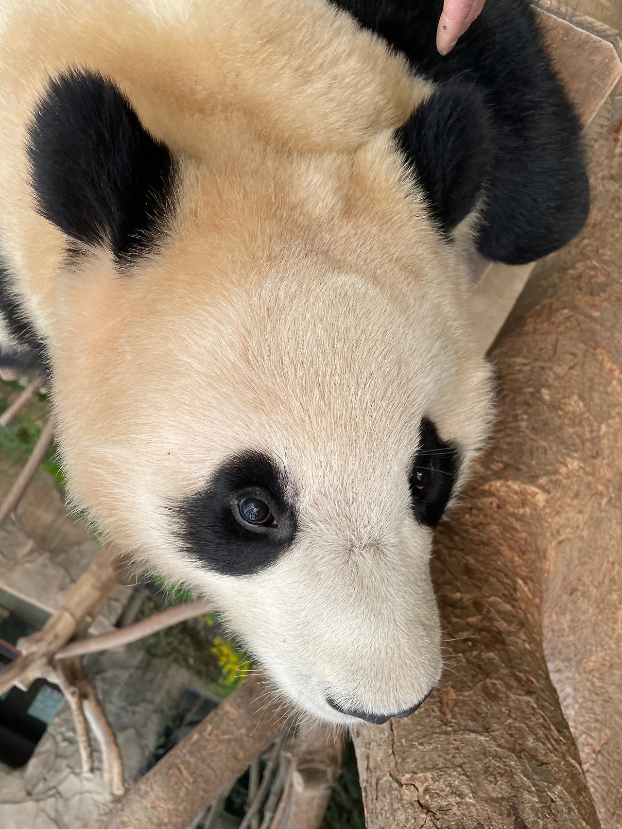 푸바오는 엄마를 올려다보며 따지듯이 물었어요.