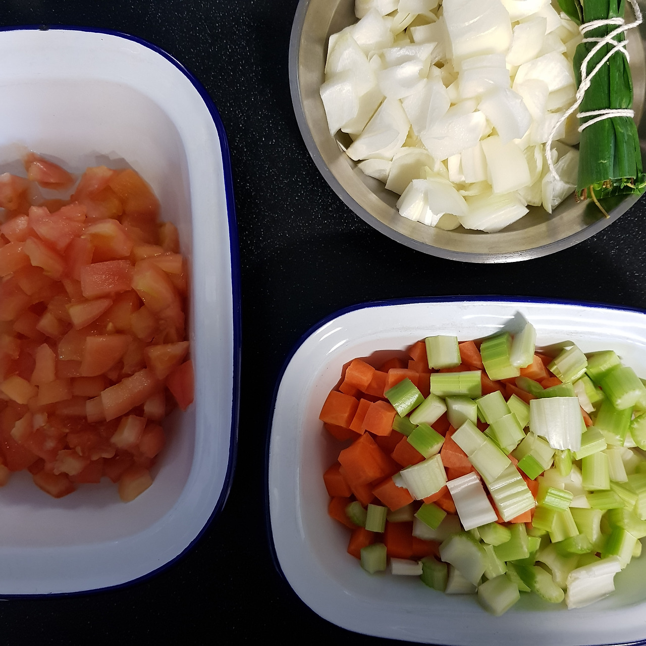 주재료 대하와 비스끄의 풍미를 줄 향채(당근.샐러리.양파) 그리고 토마토와 플랑베 해줄 꼬냑과 빠질수없는 허브다발 부께가르니.