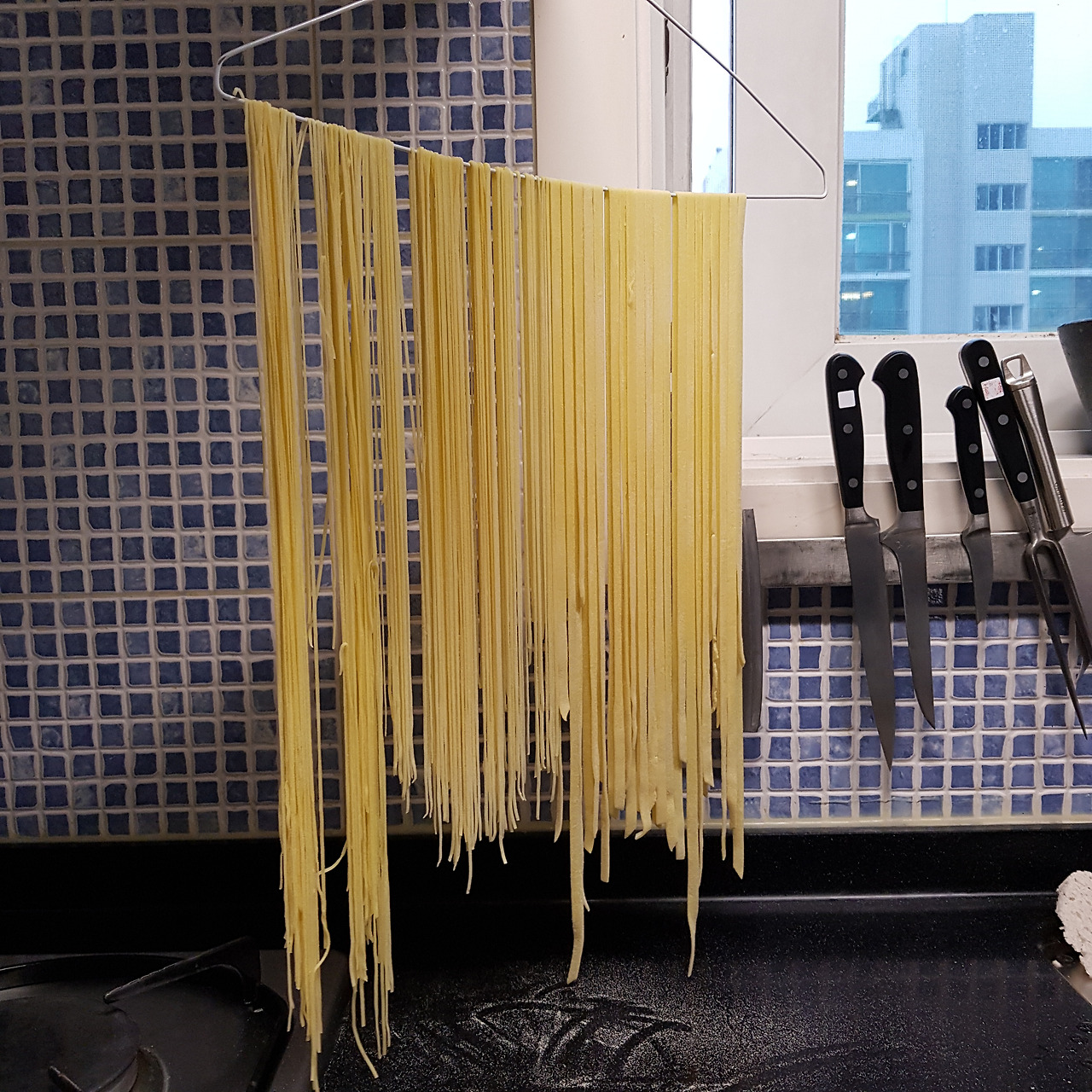파스타 건조대인 타카 파스타가 없어 옷걸이에 빨래널듯 휘릭.멀리서보니 요즘 유행하는 마크라메 같기도하고..하하핫. 건조할때 면들이 서로 엉겨 붙을수있으므로 꼭 세몰리나가루를 충분히 뿌려줘야한다.최현석쉐프의 소금 퍼포먼스마냥 아낌없이 멀리서 가루를 팍팍 뿌려주어야한다.