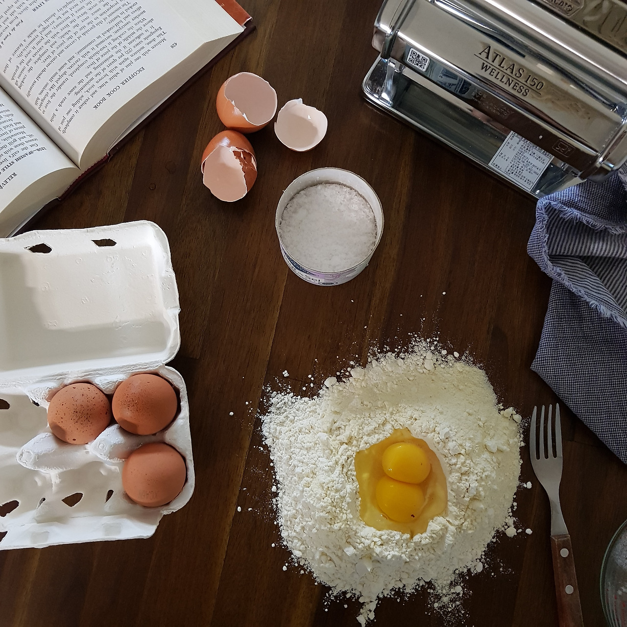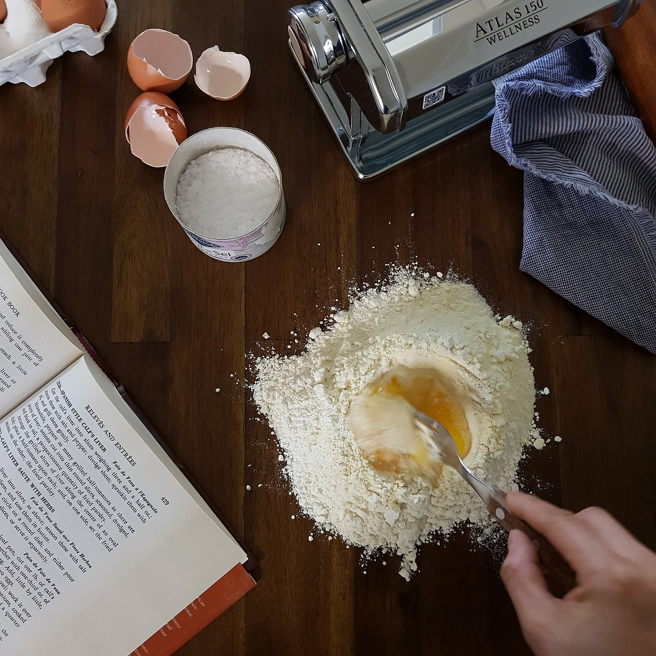 파스타면은 다소 건조한 텍스쳐이다.머신에 롤링할때 너무 질척하면 다 늘러붙어 파스타면이 안나오거나 안될수가 있다.손에 반죽이 딱 떨어지는.반죽이 뭉쳐지기만하면 되는 그런 텍스쳐이다.어느정도 뭉쳐질때까지 물을 조금씩 아주 조금씩 넣어가며 반죽해야한다.
