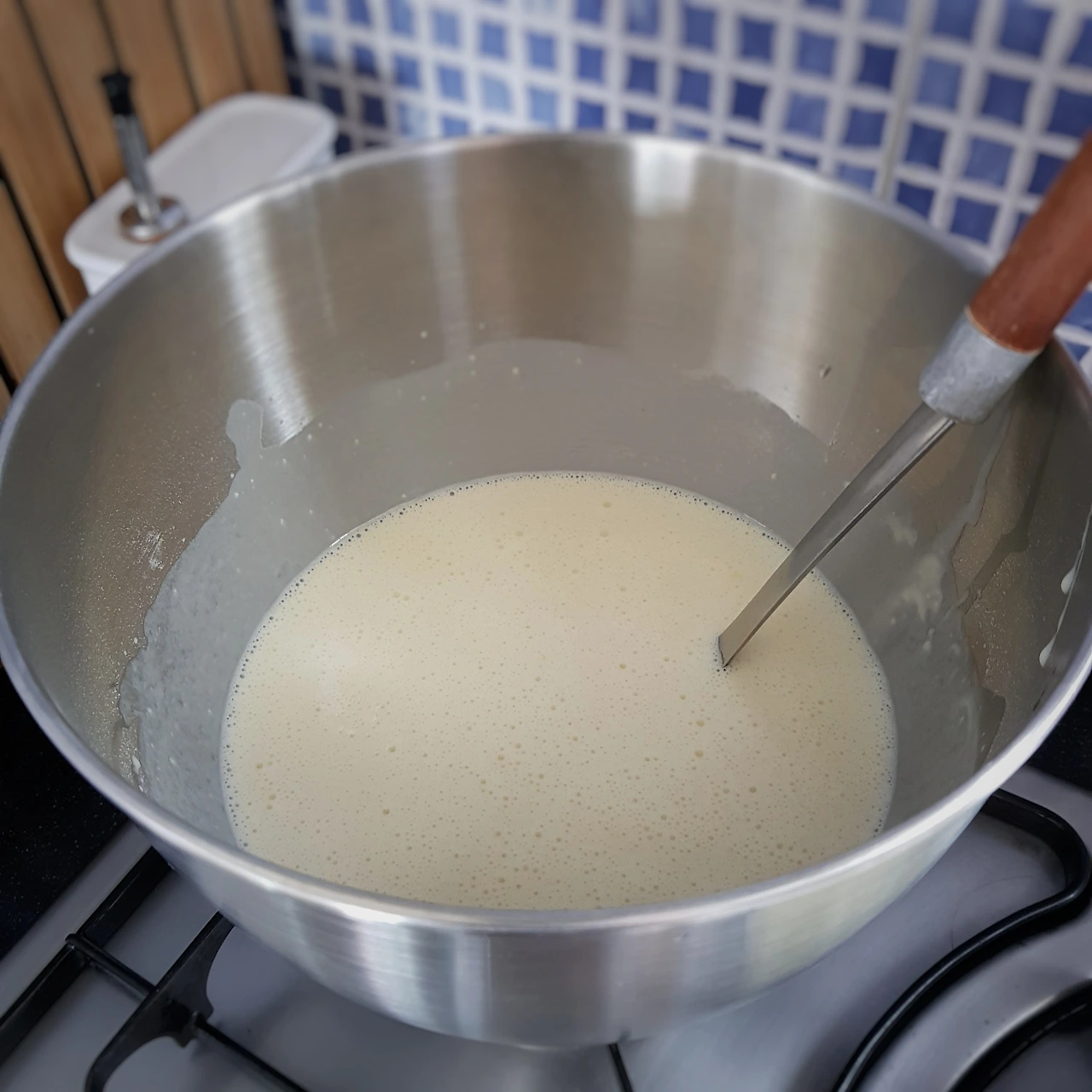 크레프의 반죽은 팬케익반죽처럼 몽땅넣어 잘 저어주면 된다. 차이가 있다면 크레프에는 베이킹파우더가 들어가지 않는다.