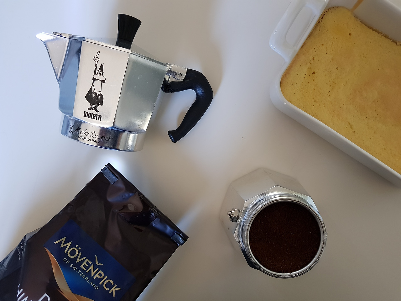 5. 비스뀌 시트를 데운 에스프레소+럼에 충분히 적시고 그 위에 마스카포네 크림을 부어준다.