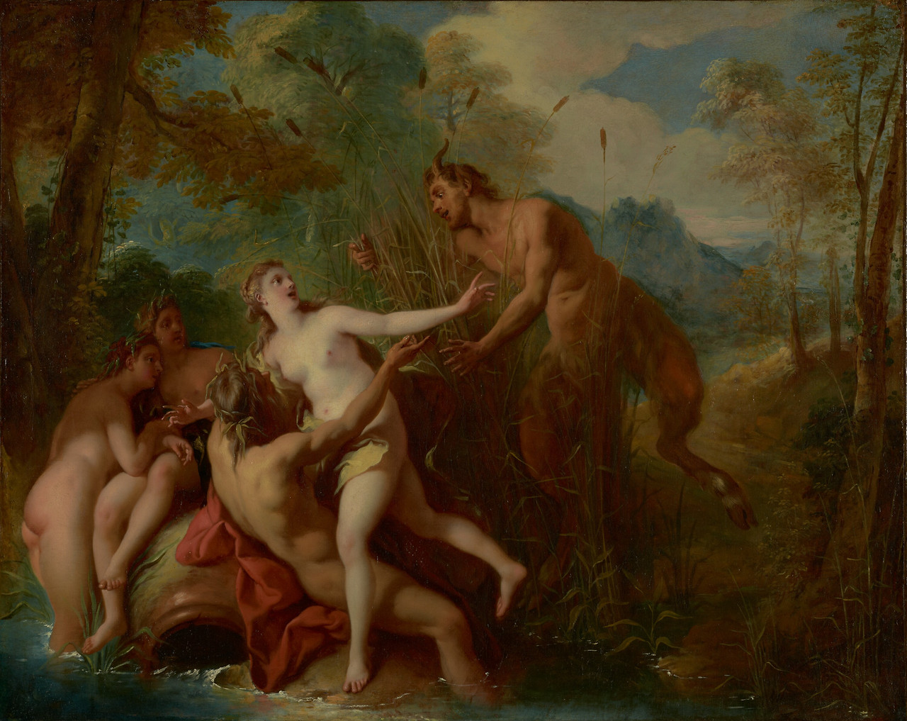 아버지인 강의신 라돈의 품에 안긴 시링크스는 변신 직전의 공포 속에서 판을 바라보고, 주변의 님프들은 두려움에 떨며 불안한 눈빛으로 옹기종기 모여 있다.