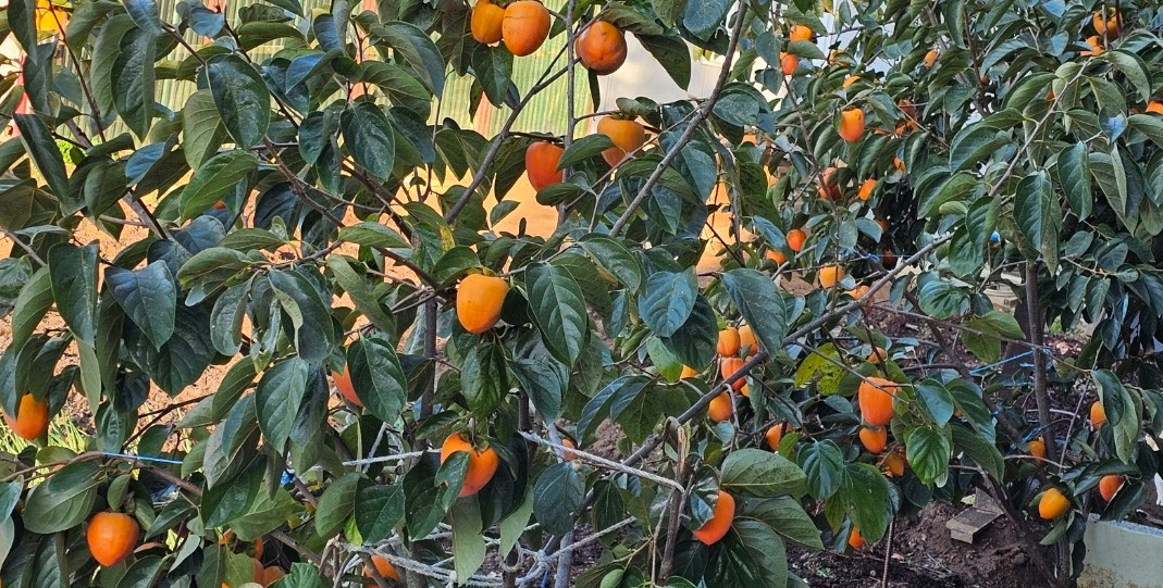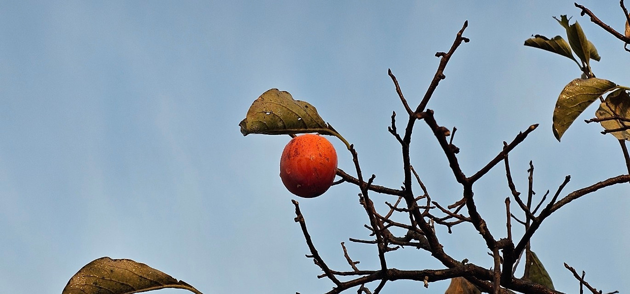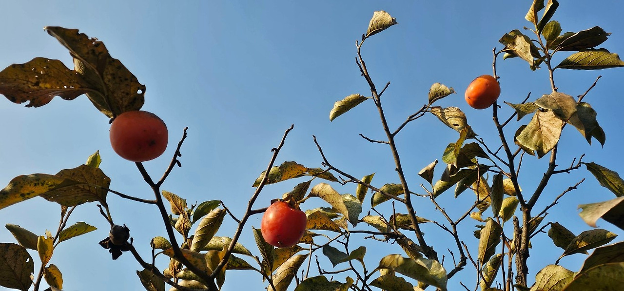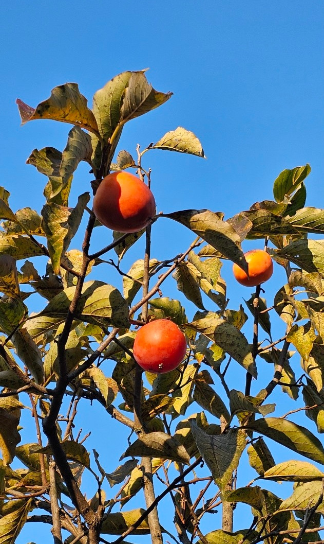 너무 오랜 세월을 견디느라 줄기의 가운데가 괴사해 나무가 둘로 갈라져 있지만 가지가지마다 주홍빛을 머금은 감들이 주렁주렁 매달려 있어 눈길을 끈다.