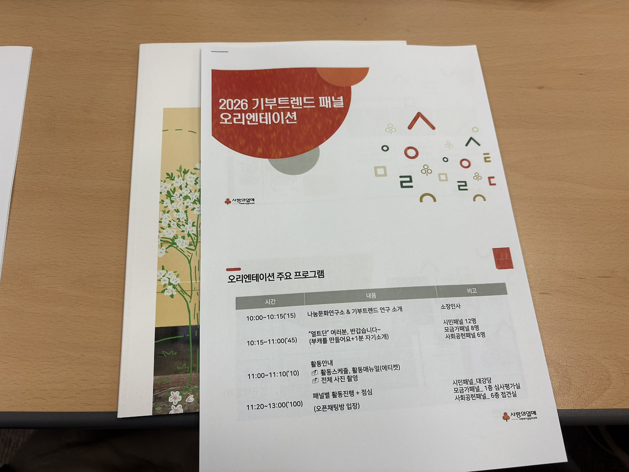 이 책은 시민 패널과 전문가 패널이 함께 만드는 참여형 연구로, 비영리와 기업의 사회공헌 실무자들이 패널로 참여한다. ‘기부트렌드 2026’에 나는 전문가 패널로 선정되어 참여하게 되었다. 대학에서 모금 업무를 하는 사람으로서, 이번에 유일하게 선정된 것도 의미 있었다. 주말, 오리엔테이션에 참여하며 이 여정의 첫 걸음을 내딛었다.
