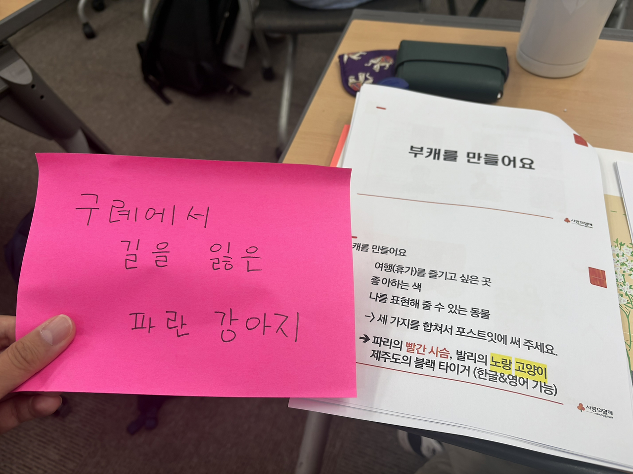 자기소개 시간은 ‘부캐 만들기’였다. 여행하고 싶은 장소, 좋아하는 색, 나를 닮은 동물을 조합해 나를 소개하는 시간. 나는 “구례에서 길을 잃은 파란 강아지”라고 적었다.