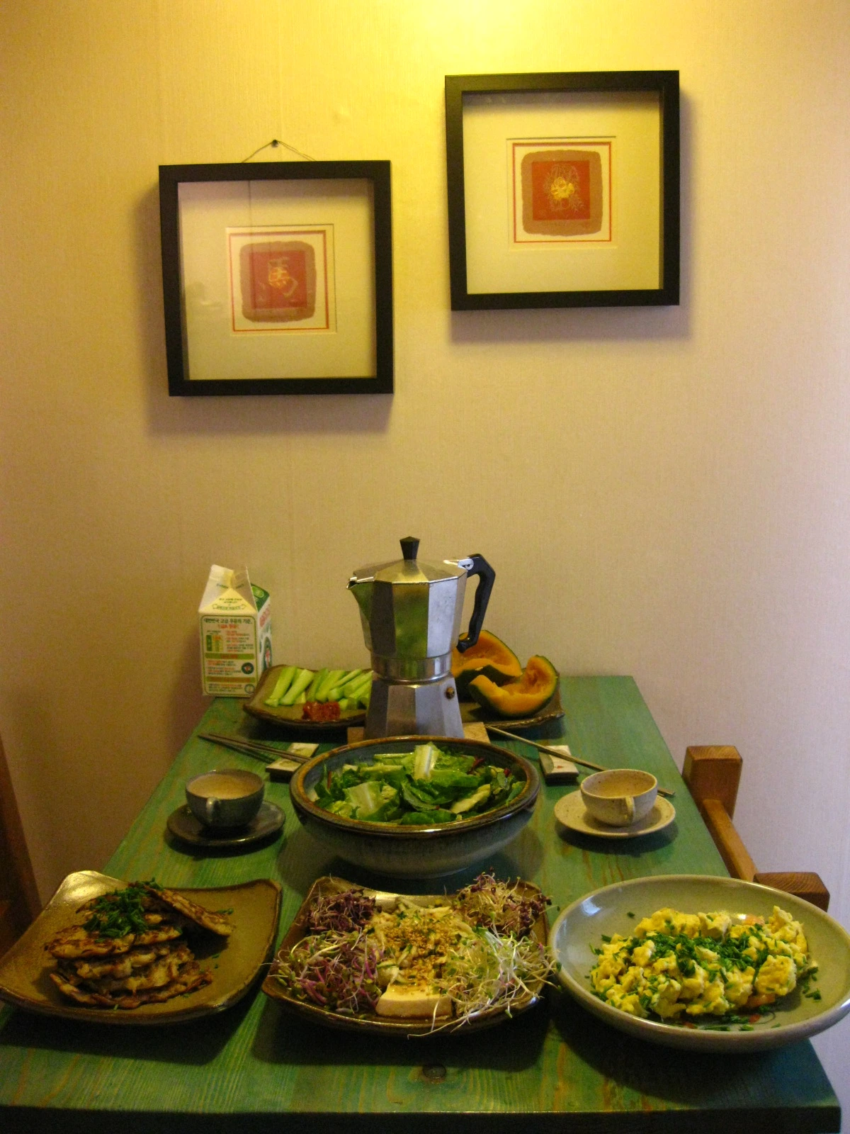 작은 식탁 위의 주말 아침 밥상, 계란, 야채, 커피에 오이 찍어먹을 쌈장도 저기 빠지지 않는다. 신혼여행 다녀온 그리스 산토리니의 파란색으로 주문 했지만, 나무에 칠하니 딱 그 색은 안 나온단다. 그래도 예쁨!! 미안해 하시는 작가아저씨 마음도 예쁨!!