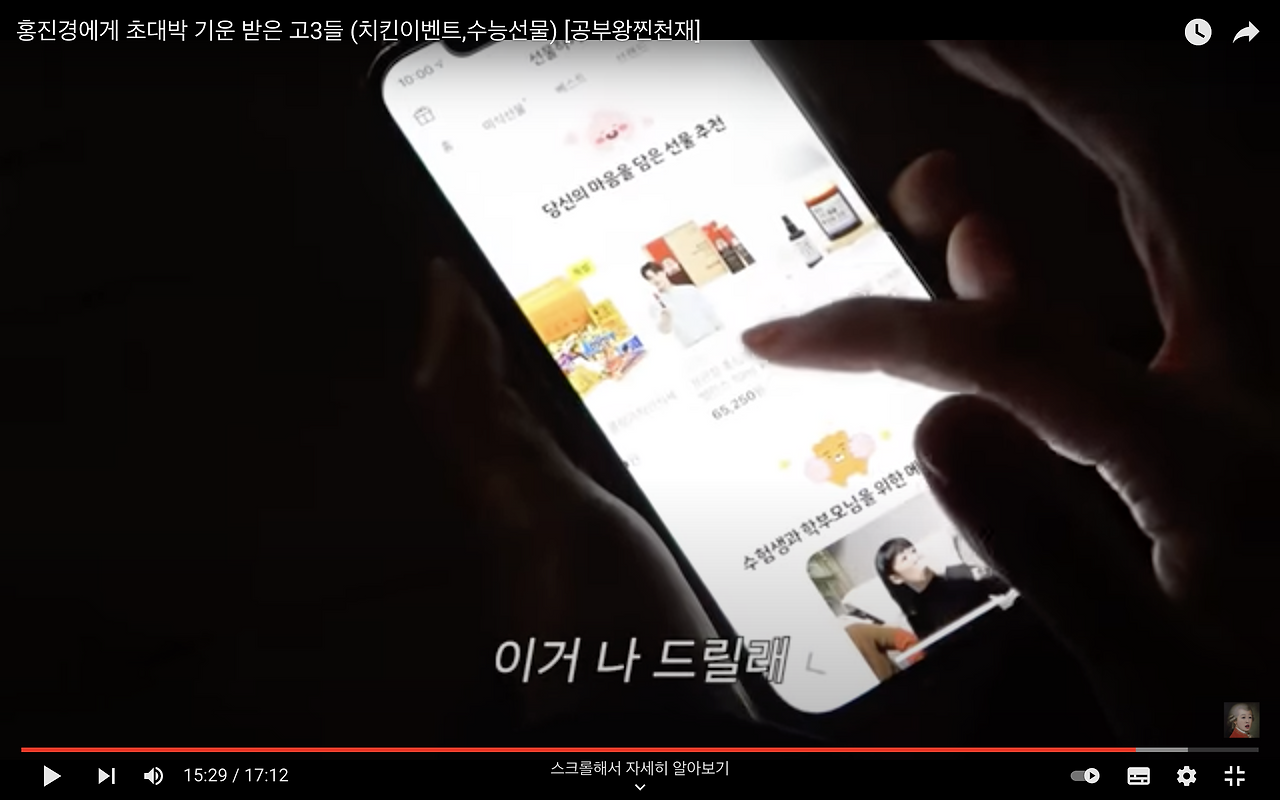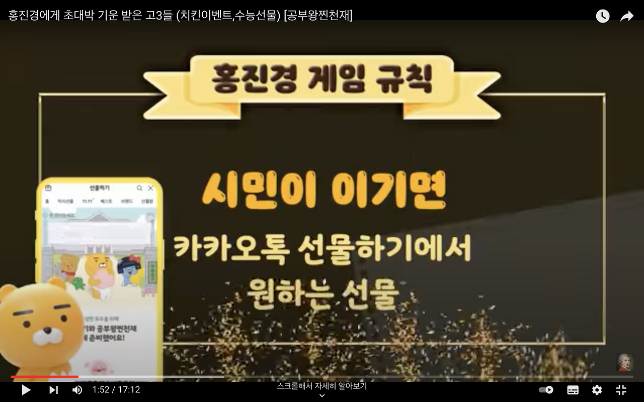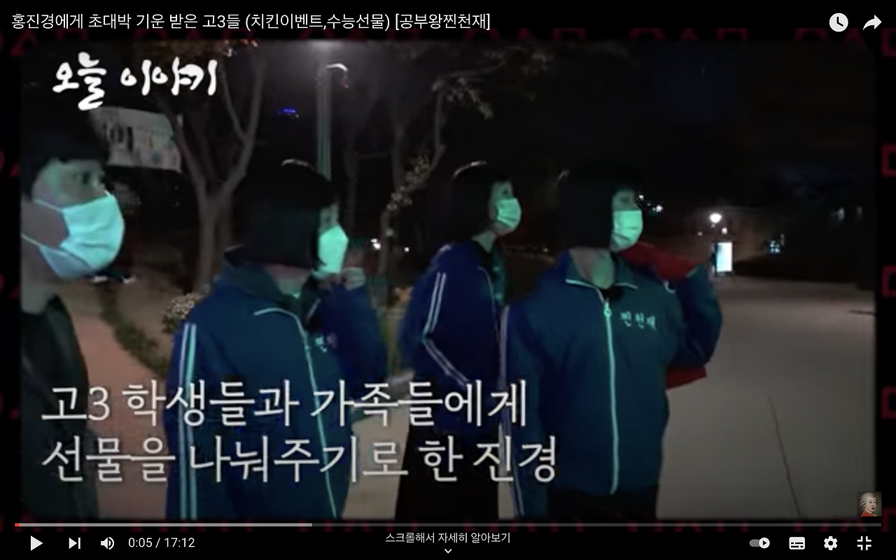 유튜브: 홍진경에게 초대박 기운 받은 고3들 (치킨이벤트,수능선물) [공부왕찐천재]