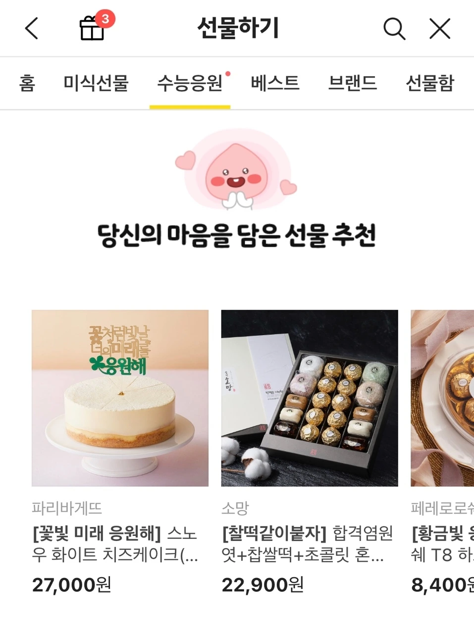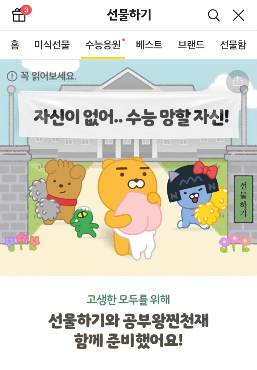 선물하기 내 하반기 주요 이슈데이(추석 / 빼빼로데이 / 수능 / 크리스마스)에 대한 논의를 하던 중, 다른 날은 알겠는데 왜 수능이 거기에 들어가 있지?라는 생각이 들었습니다. 왜냐하면 위에서 말한 것처럼 저는 어느 순간 수능을 챙기지 않았기 때문이죠. 그래도 이슈데이에는 이유가 있겠거니 하면서 생각을 해보았습니다.