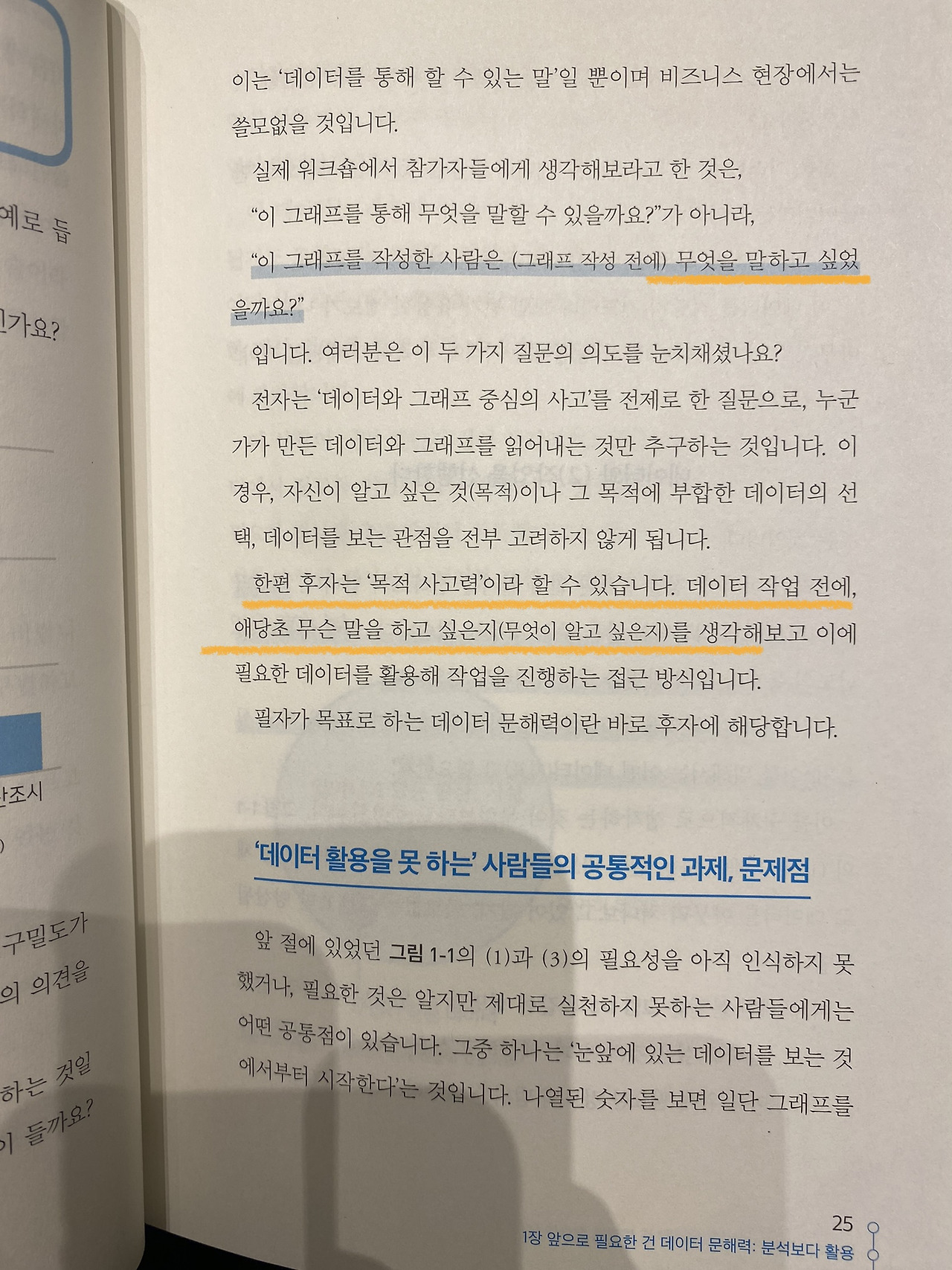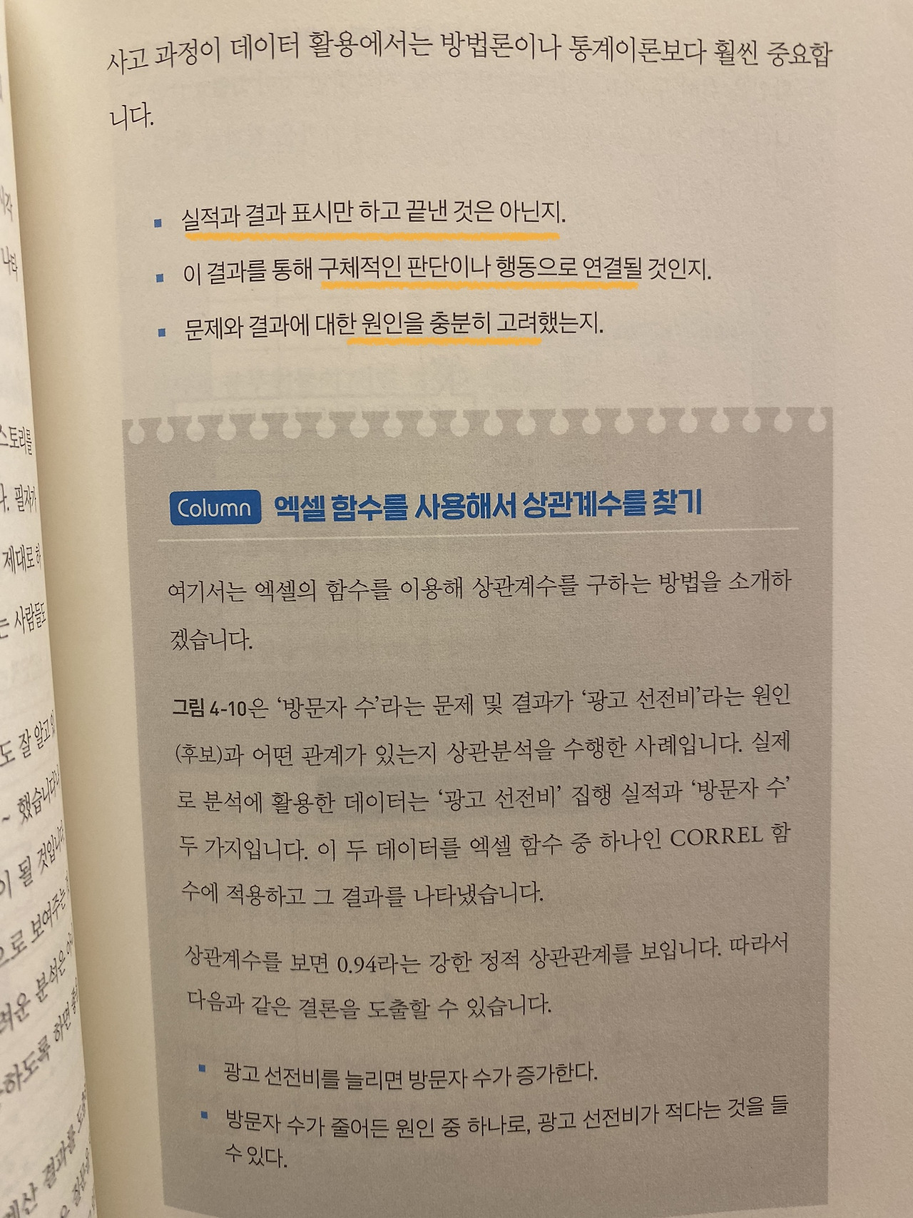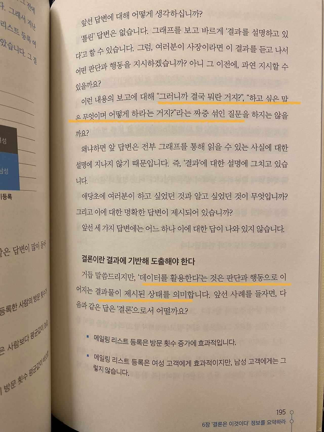 데이터 분석을 하고 멋있게 만든 표나 대시보드를 서술하는 것은 결과이다. 결론은 그 설명을 넘어서 다음 액션을 제안해야 한다. 이를 위해서 문제는 무엇인지 정의하고, 그 원인은 몇 가지라고 생각하는지 가설을 세우고, 그 가설이 맞는지에 대한 분석이 이뤄져야 한다고 저자는 얘기한다.
