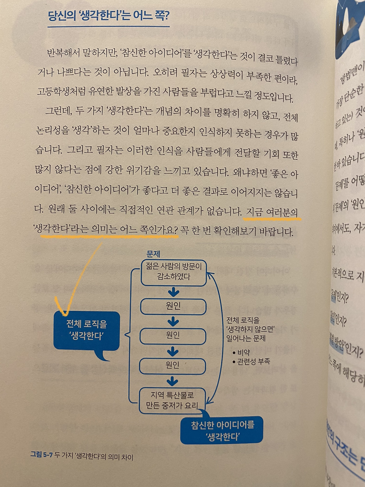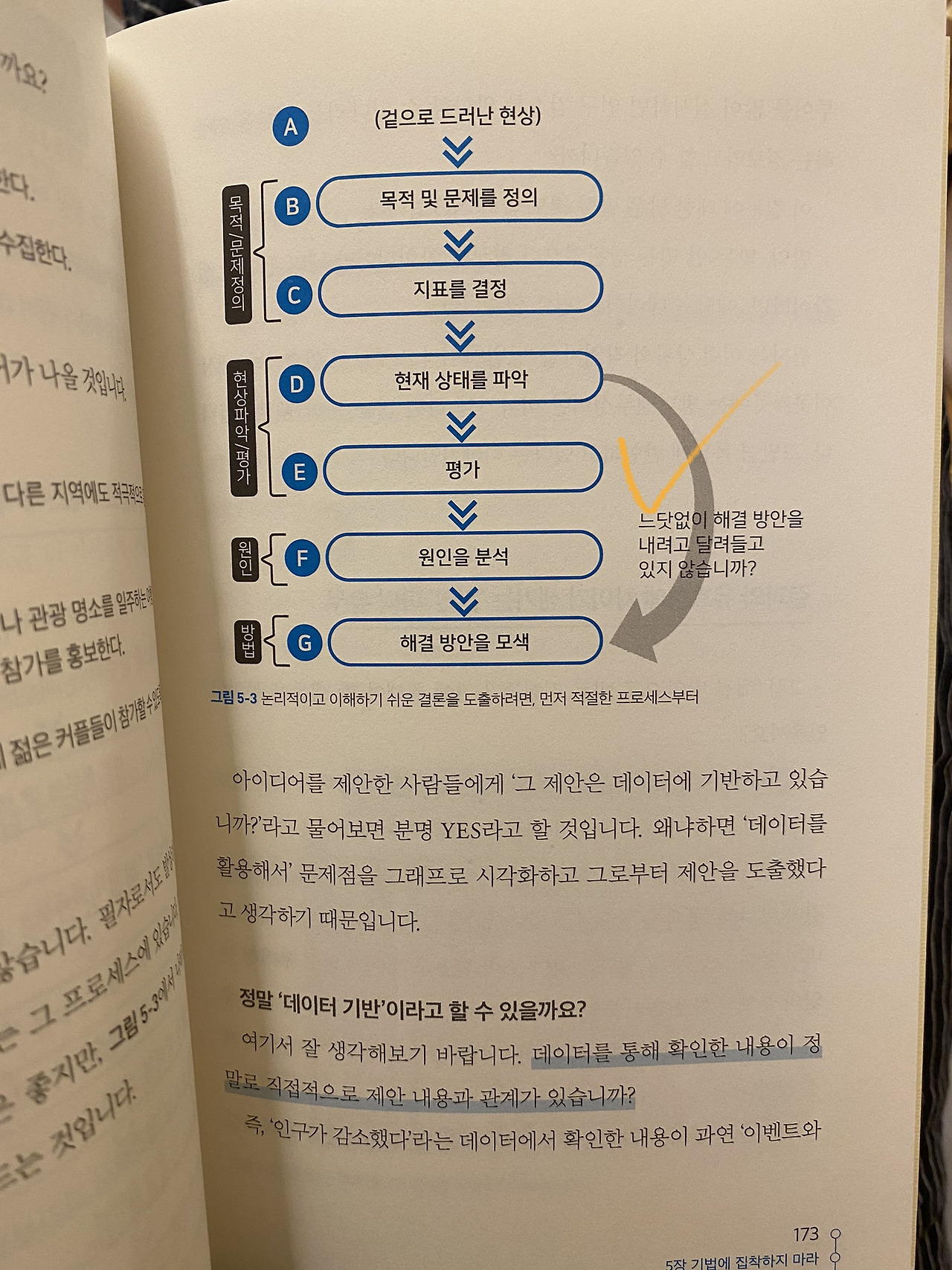 하지만 저자는 잠깐 멈추고 생각해보라고 한다. 문제 / 원인 / 해결방안을. 문제라고 생각했던 것들이 보통 원인이나 해결방안을 포괄하고 있는 것이 많은데 이를 구분하는 게 첫째로 중요하다고 한다. 무엇을 말하고 싶은지, 무엇을 확인하고 싶은지를 정확하게 알기 위해서.