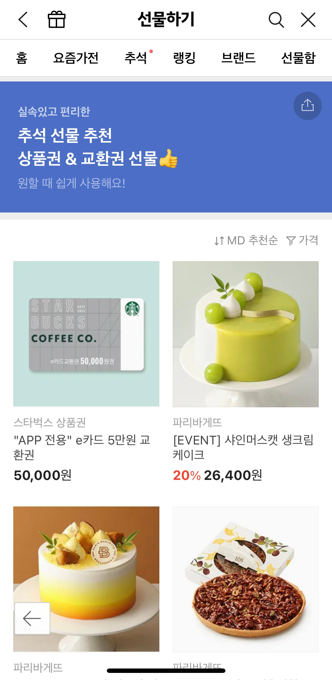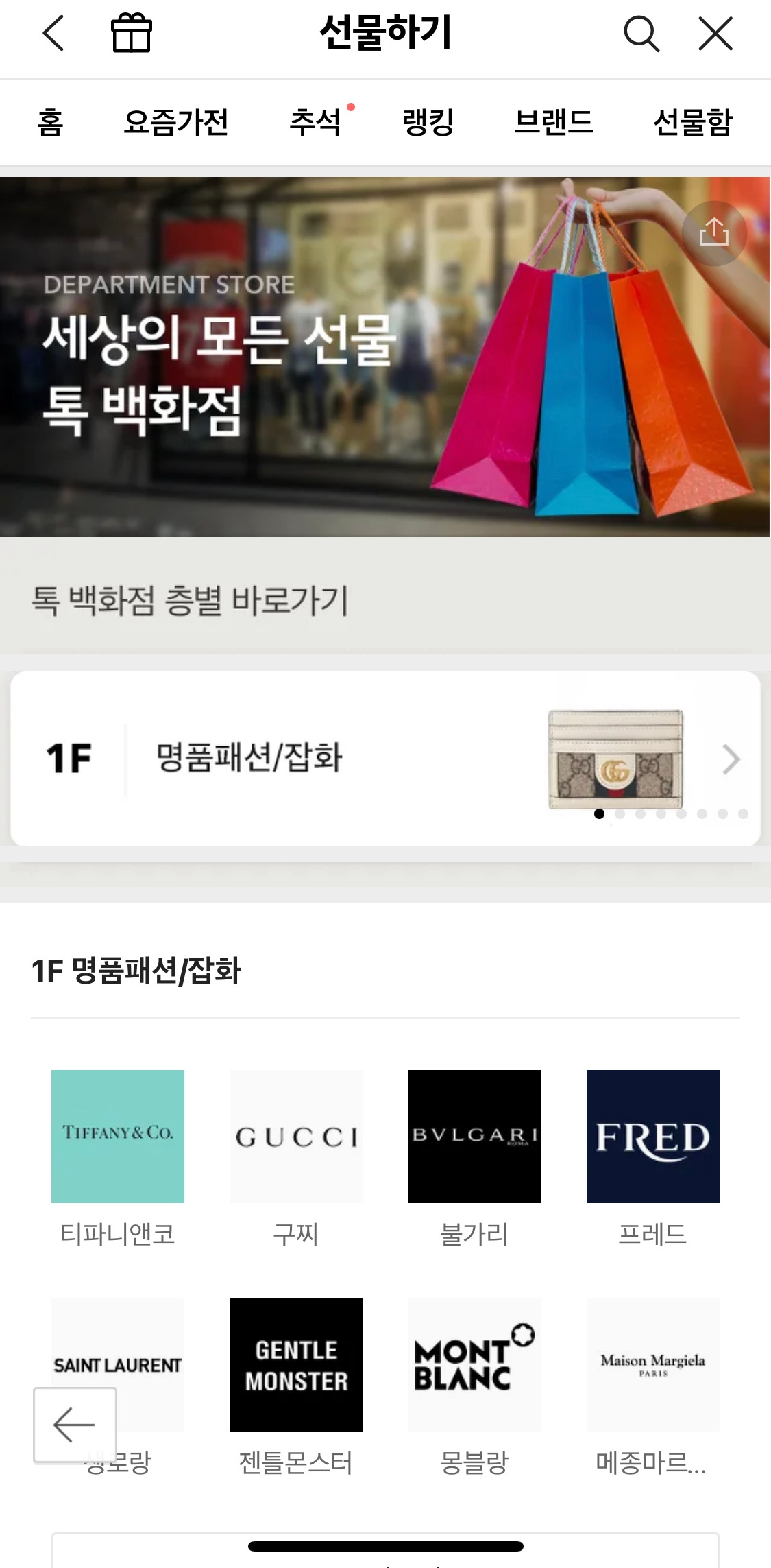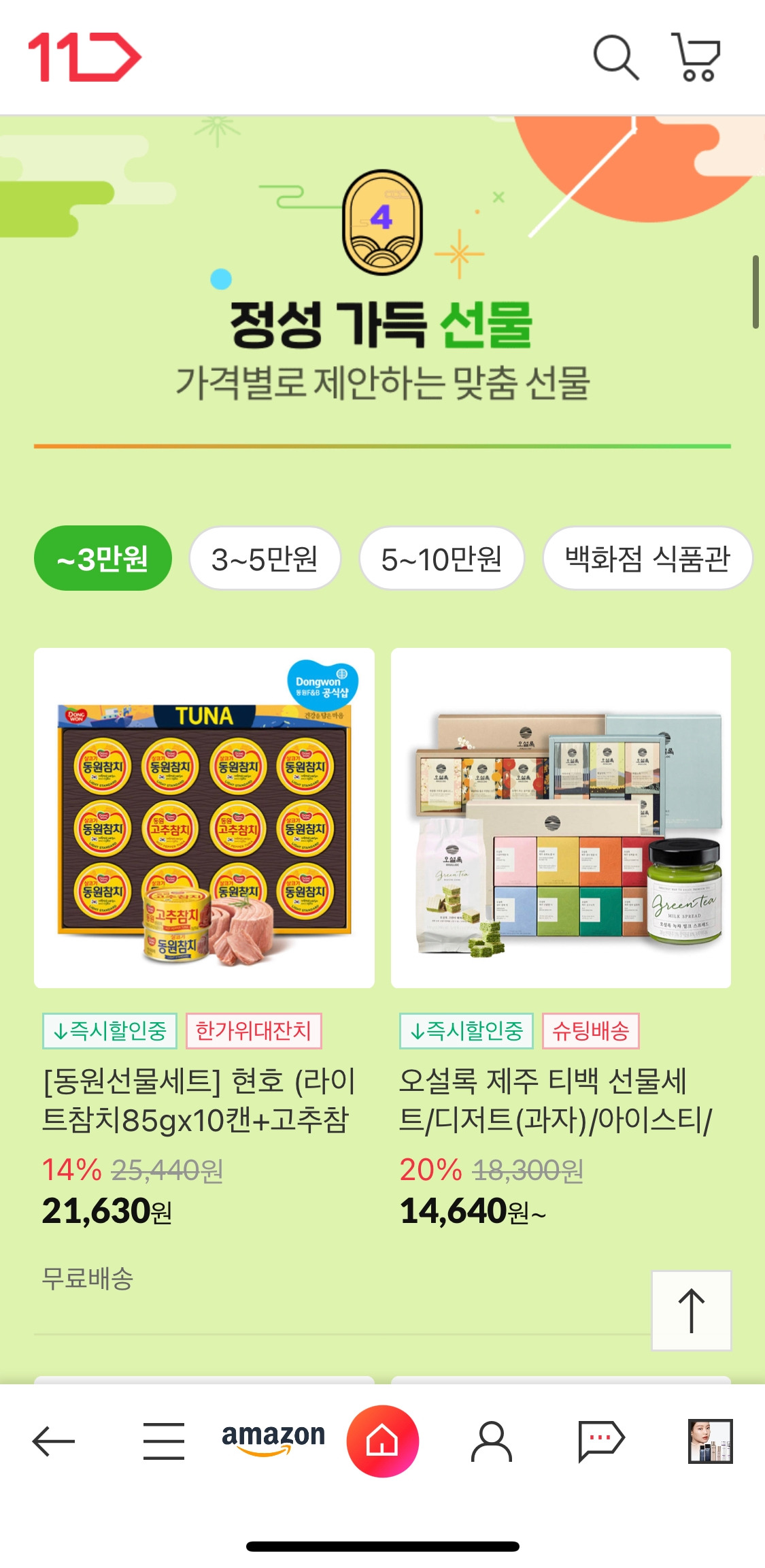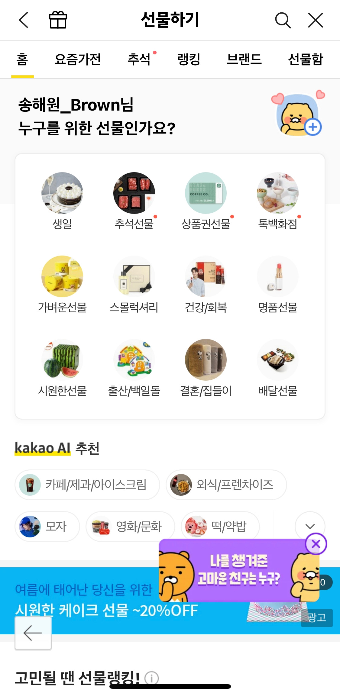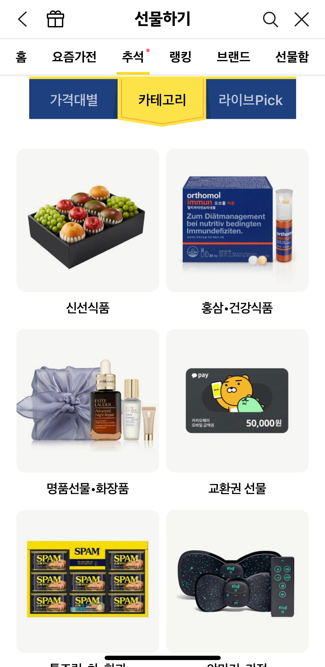 거기서 그치지 않고 홈에서도 백화점에 있을 법한 상품을 모은 “톡 백화점”부터 현금성으로 가치가 높은 “상품권 선물", 홍삼/한우/과일 등 모아둔 “추석 선물"까지 다양하게 “받는 사람"을 생각하는 걸 준비해두었다.