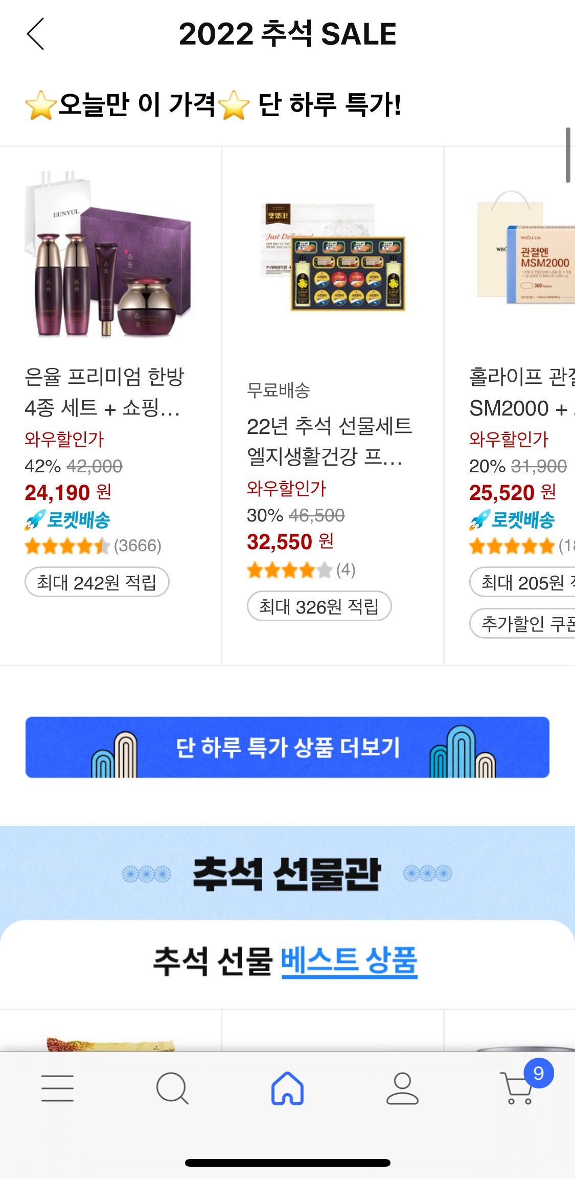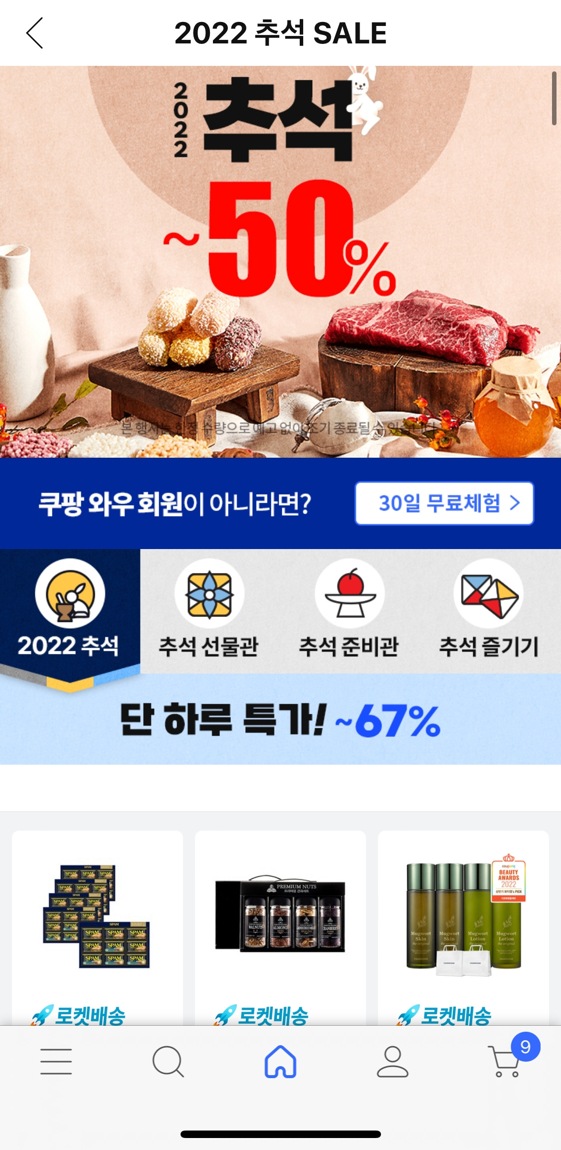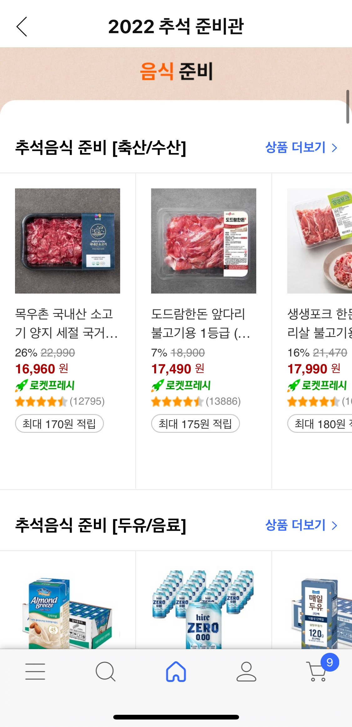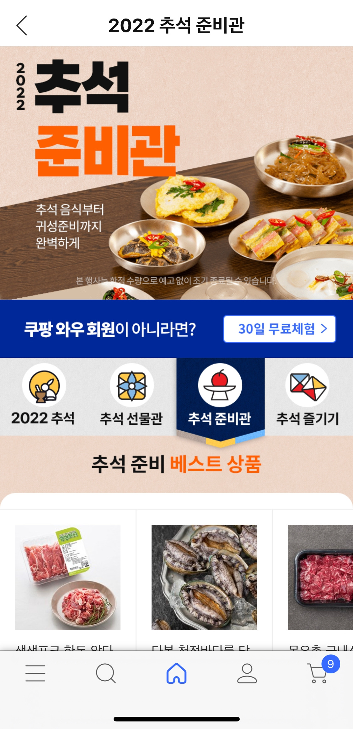 명절을 생각해보면 선물도 선물이지만 준비하는 음식과 나누는 데 초점이 맞춰져 있다. 그 준비과정을 그동안은 시장 → 마트에서 했었는데, 이제는 쿠팡이 그 자리를 차지하려고 하고 있다. 그게 추석 메인 탭에도 그대로 나타났는데, 2022 추석 / 추석 선물관 / 추석 준비관 / 추석 즐기기 이렇게 구성이 되어 있다.