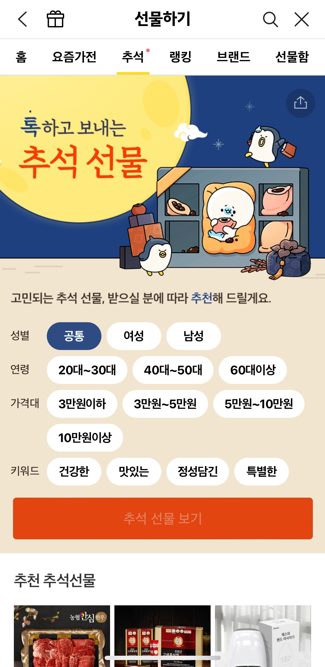이번 추석 테마는 “톡 하고 보내는 추석 선물"이다. 선물을 주는 사람 입장에서 가장 고민스러운 부분은 ‘이 선물을 줬을 때 받는 사람이 좋아할까?’ 일 텐데, 그 가려운 부분을 해소해주고자 노력을 하는 중이다.