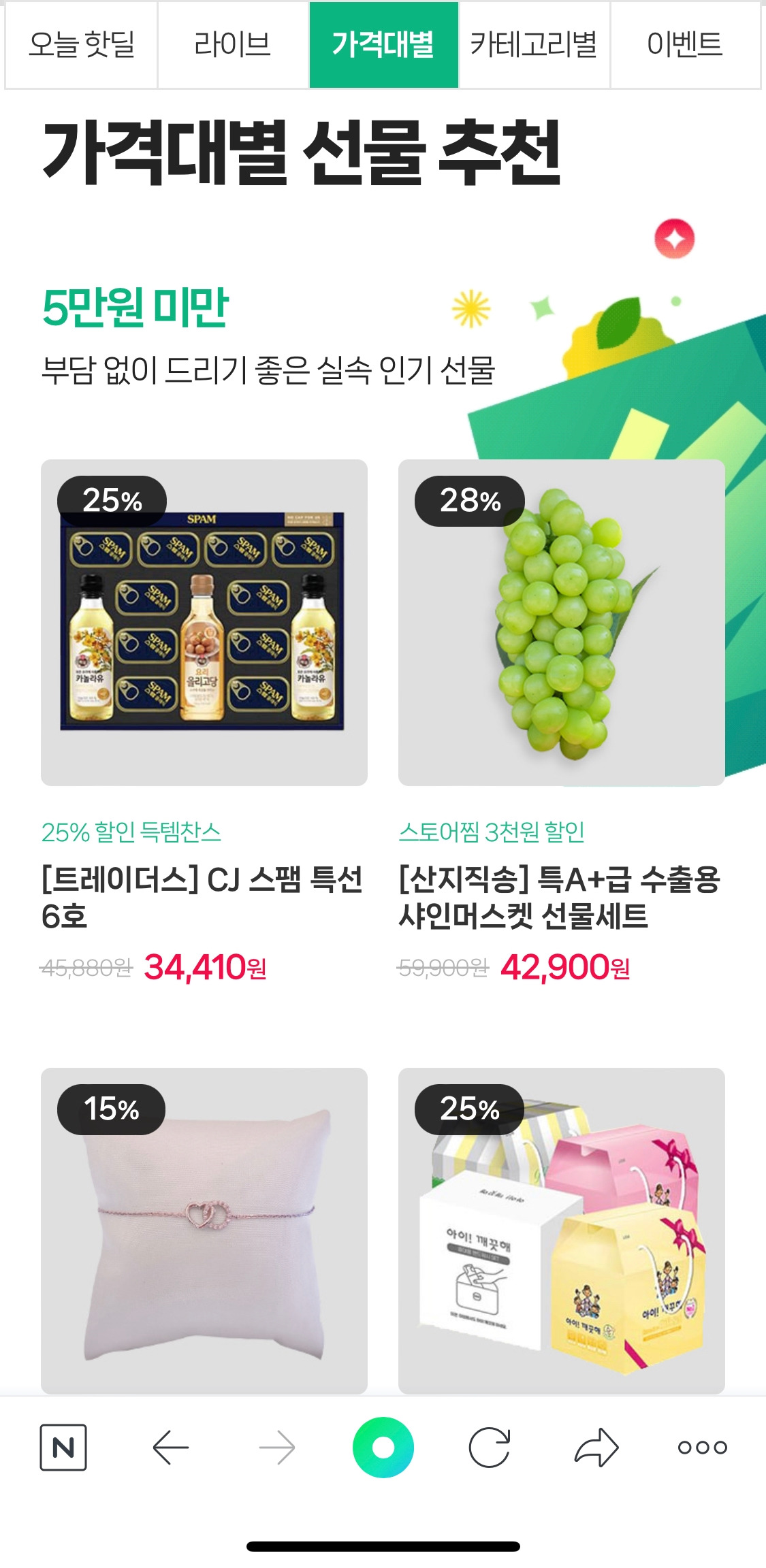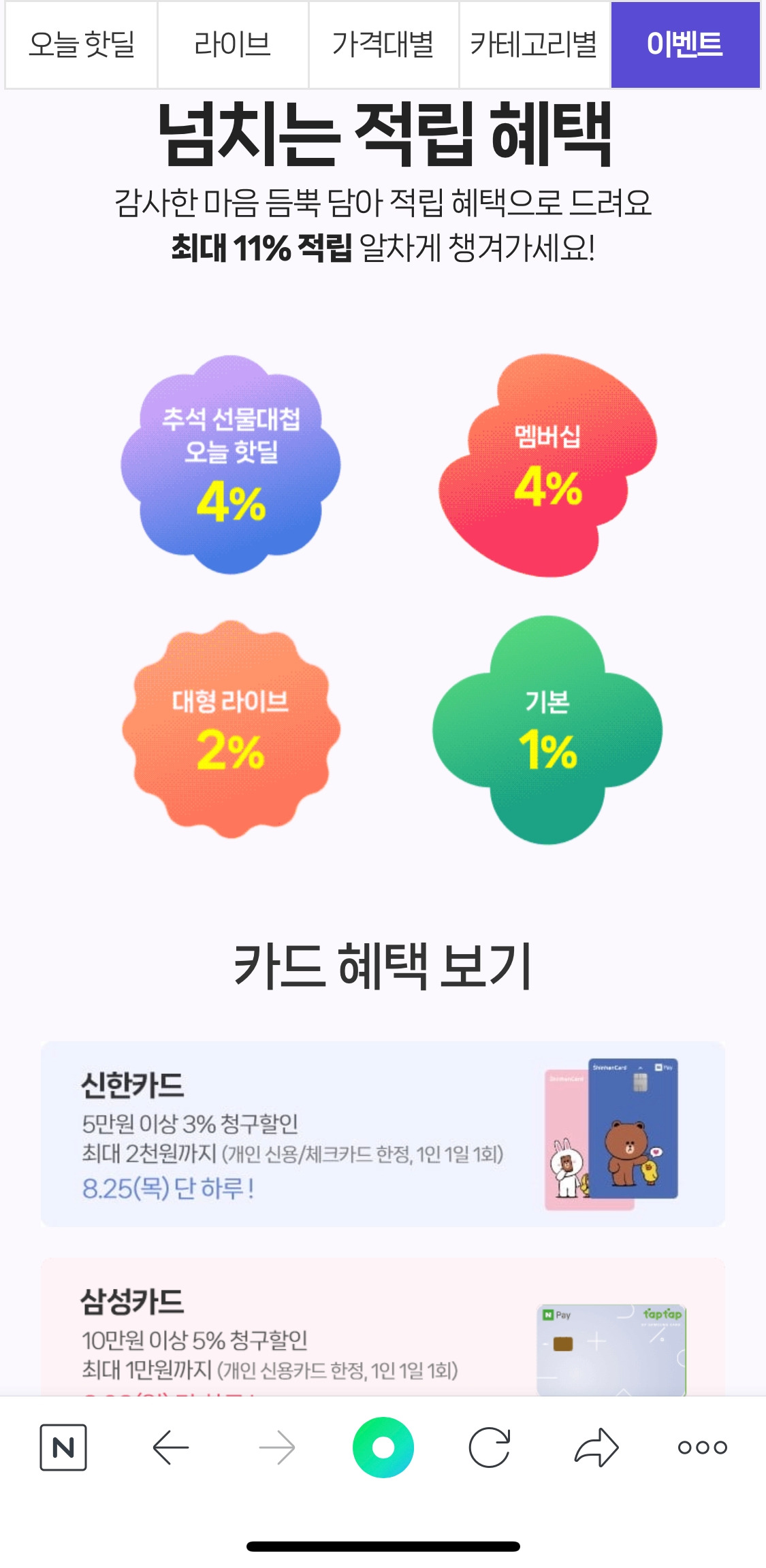 선물 제안도 제안이지만, “추석 선물 대첩"을 통해서 구매를 유도하고 있었다. 탭 구성은 핫딜 / 라이브 / 가격대 / 카테고리 / 이벤트 순이었고, 네이버 쇼핑의 묘미인 핫딜과 다양한 혜택을 담은 이벤트 구성을 한눈에 볼 수 있도록 한 게 특징이었다.