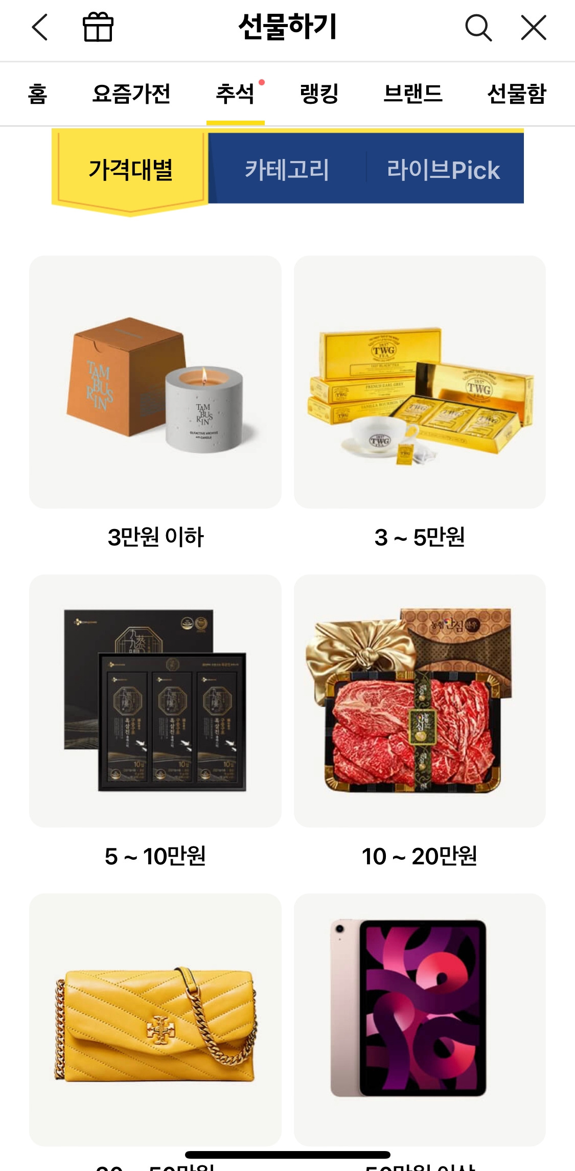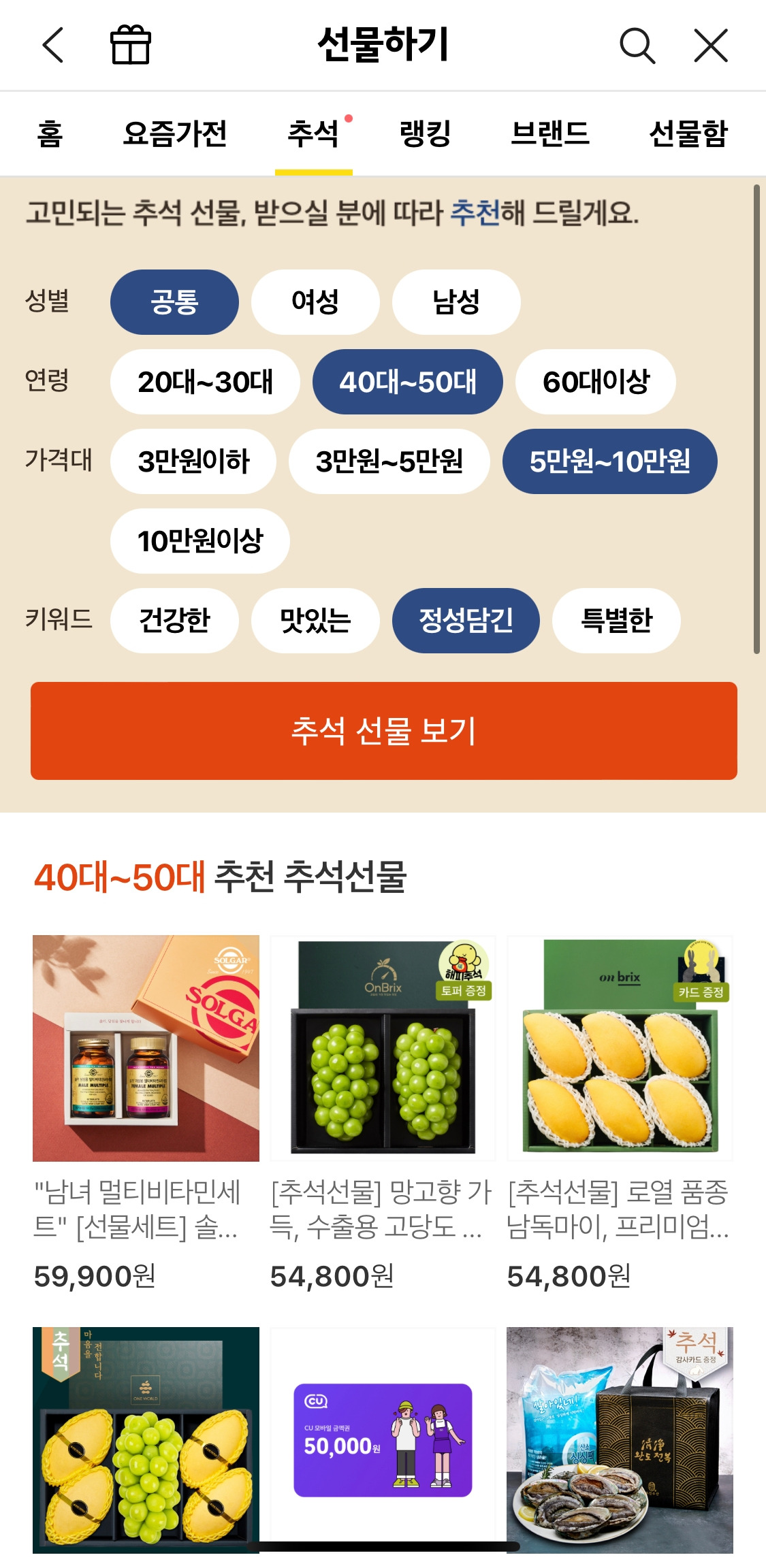 추석 탭에서 눈에 띄는 건 “연령대"를 고려한 선물을 제안한 점이었다. 기존에는 가격대 / 카테고리별 제안에 그쳤다면, 이번에는 연령대도 고려한 선물 가장 위에 보인다. 이 부분은 20-30세대가 친척/관계에서 성의를 표시하는 것도 분명히 있겠지만, 지난 몇 년간 중장년층분들도 서로 편리하게 주고받고 있는 걸 반영한 건 아닐까?