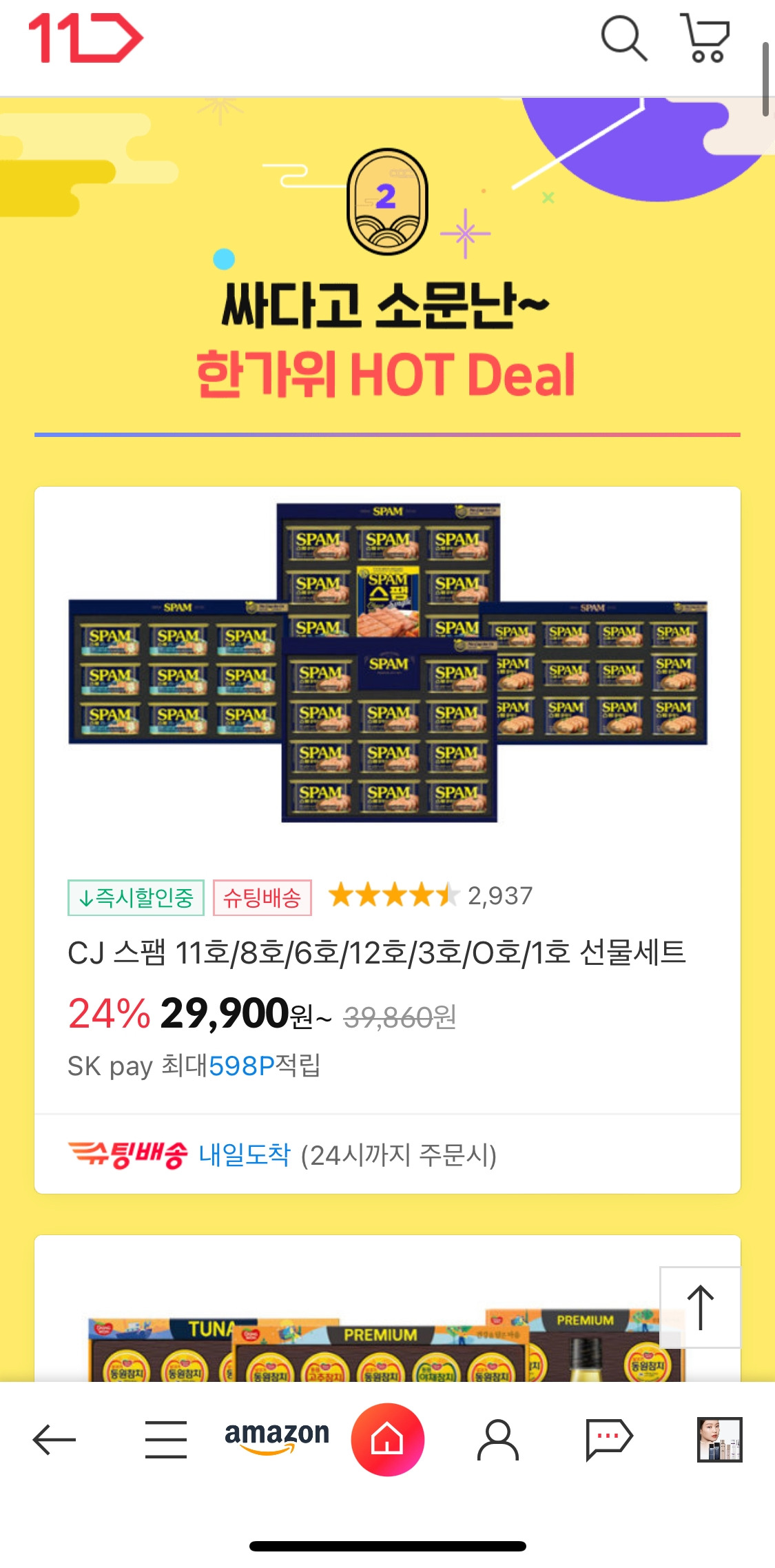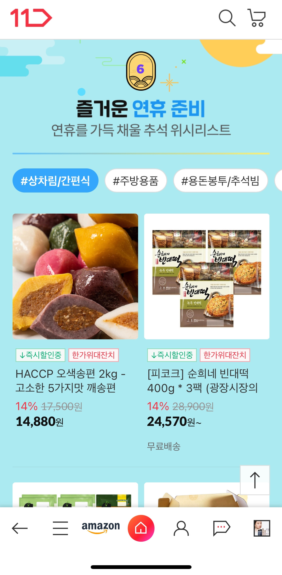 다른 곳들과 비교해서 가장 “할인"에 진심인 11번가. 메인 탭 구성도 할인 혜택 / 핫딜 / 오늘의 브랜드 / 추석 선물 / 연휴 준비 순으로 되어 있었다. 다른 커머스들은 직관적인 숫자를 보여주면서 실제 상품에서 가격을 인지하게끔 한다면, 11번가는 ‘할인을 이렇게 준비했는데 안 살 꺼니?’라는 느낌을 주었다.