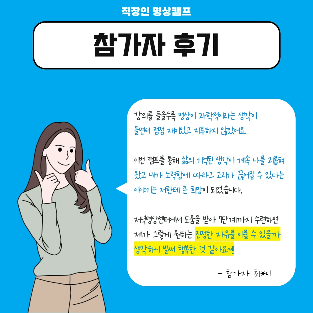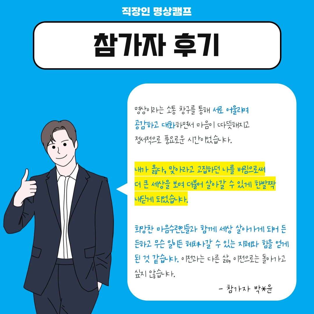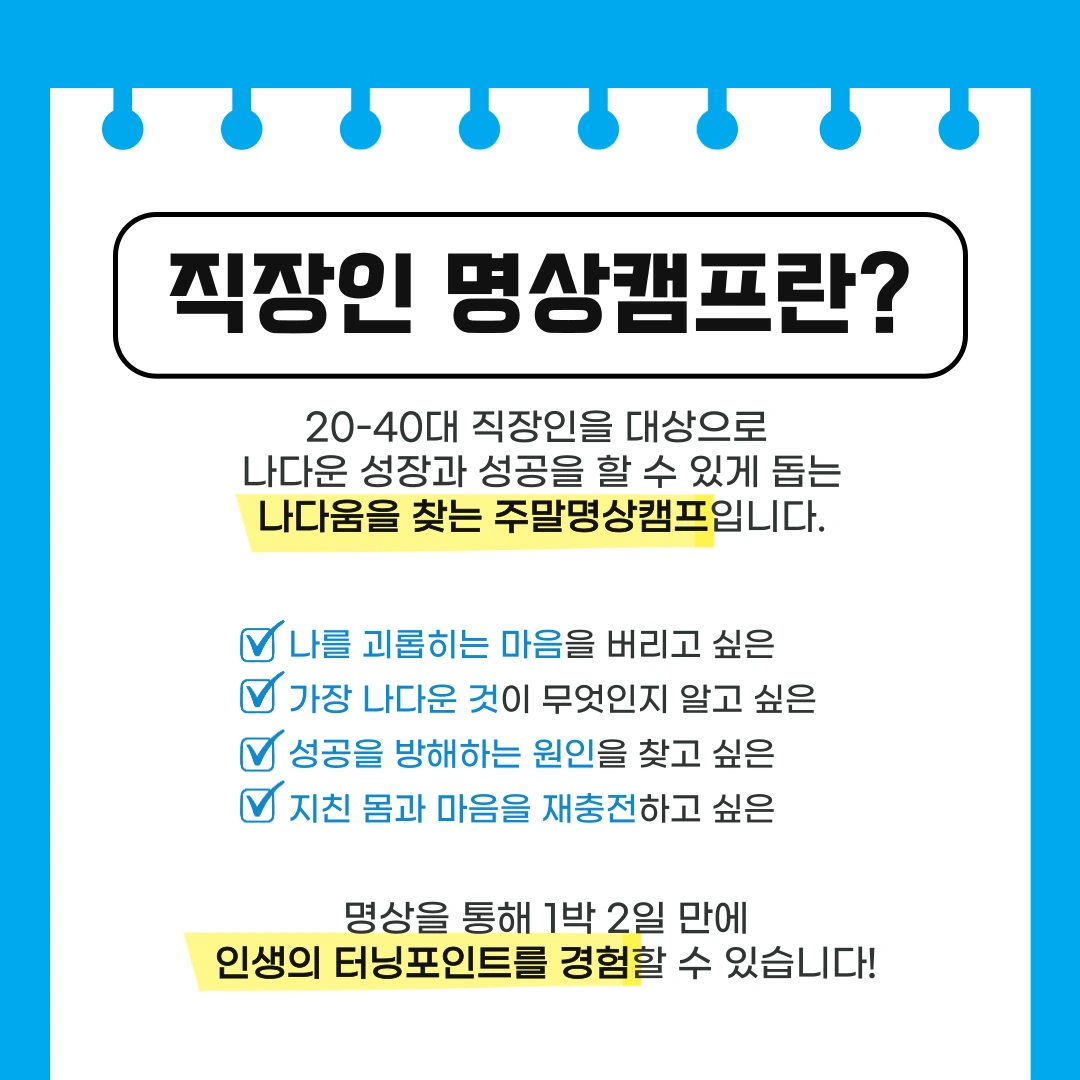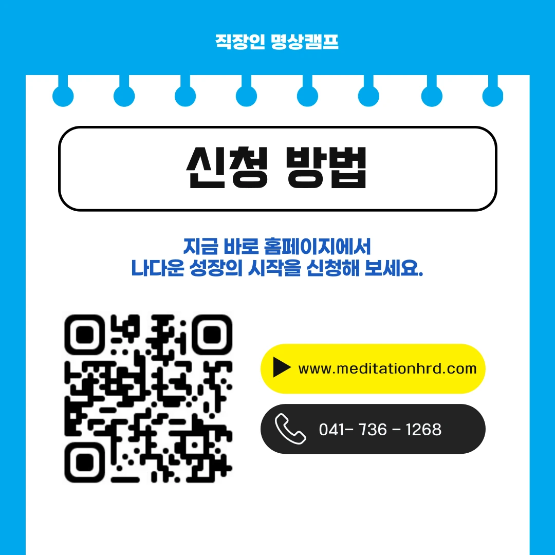 어떻게 하면 될지 궁금한 분들이 있으실 텐데, 직장인들이 참석해 보면 좋을 명상 프로그램을 추천드려 봅니다.