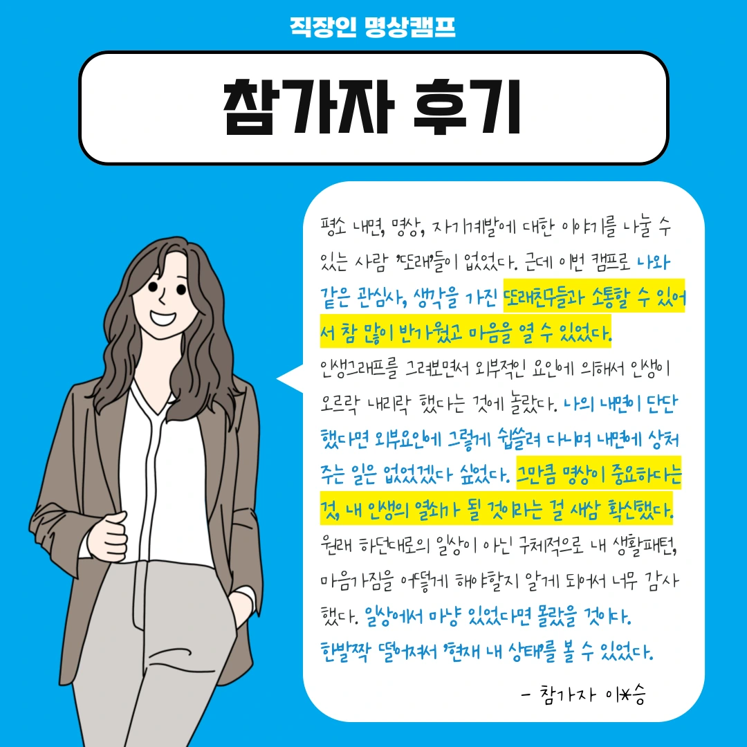 직장인 멘토들과 15년 이상의 명상 안내 전문가들의 밀착케어로 여유 없는 일상에서 벗어나 진정한 힐링을 해볼 수 있다고 확신한다.