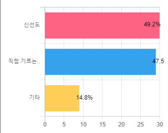 그 이유로는 신선도가 49.2%로 가장 컸으며, 직접 기르는 재미(취미 목적)를 위해서가 47.5%로 거의 비등했습니다.