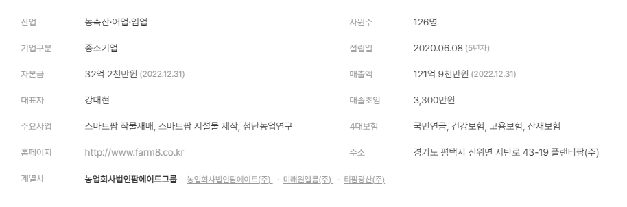 출처: 잡코리아수직농장 불모지인 시절 일본 미라이 그룹으로 부터 매우 바가지 씌워져서 수직농장을 들여오고 그것을 내재화 시켜 나가며 국내 수직농장 사업을 선도한 1세대 스마트팜 기업이죠. 팜에이트에서 20년에 자회사로 분리되었습니다. 이제 팜에이트는 샐러드 유통 기업, 플랜티팜은 스마트팜 시설물 설계 ~ 시공, 작물 재배까지 하는 재배 장치 토탈 솔루션 기업이라고 보시면 됩니다.