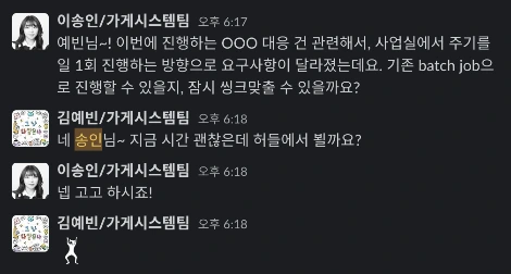 4. 고객(예: 사업실)의 요구사항이 달라지면, 변경사항과 작업 내용에 대해 짧게 싱크를 맞춘다.