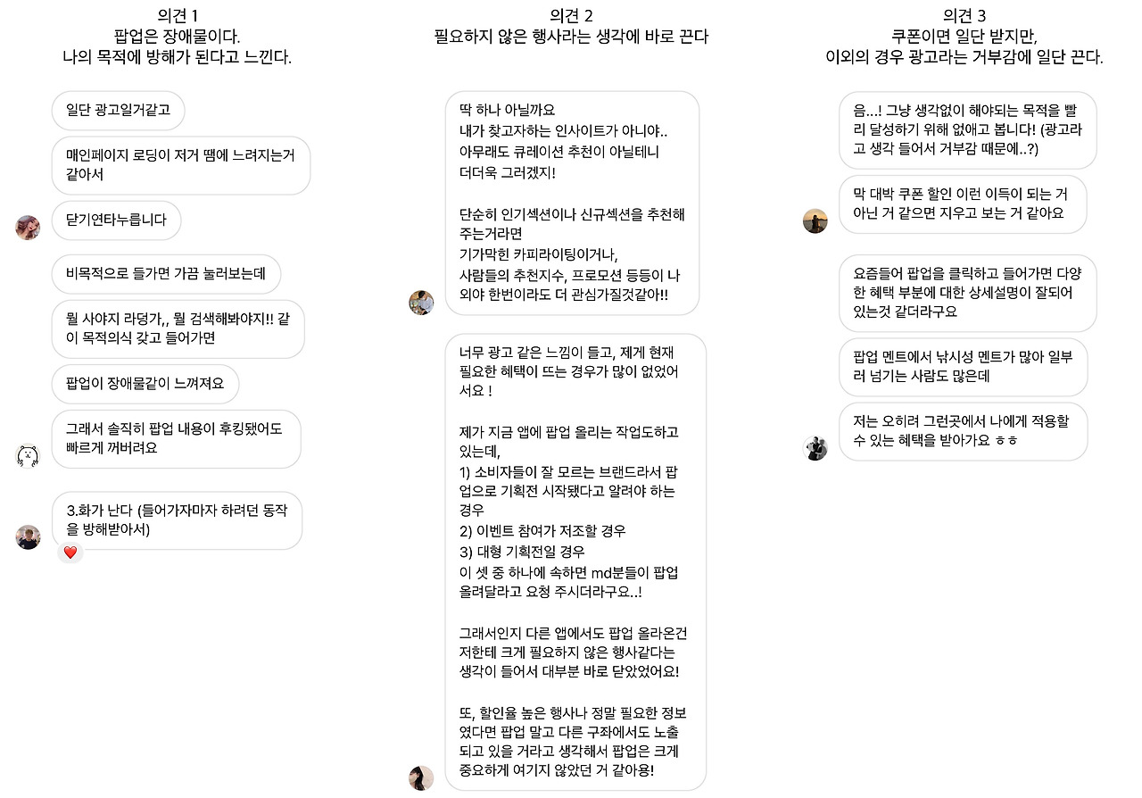 의견1. 팝업은 장애물이다. 나의 목적에 방해가 된다고 느껴진다.