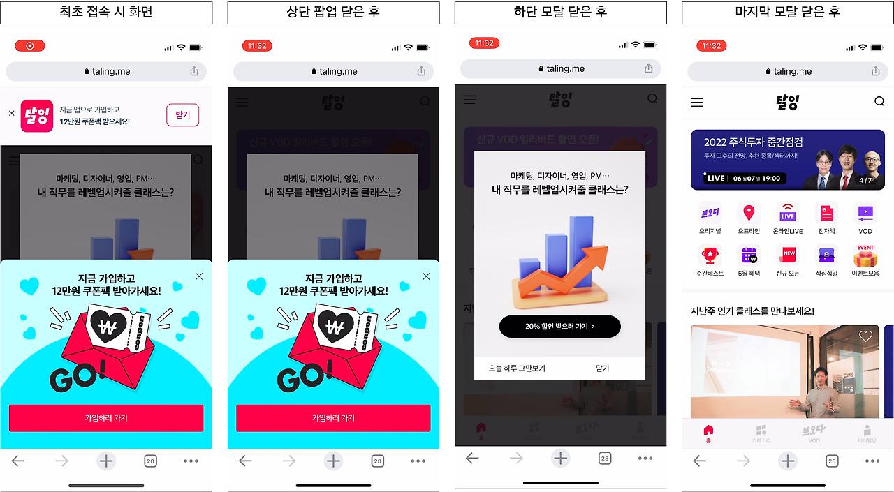 나는 모바일 웹 화면에 접속이라는 액션 외에는 그 어떤 액션도 하지 않았는데에 3가지 모달 패널이 팝업되었다. 팝업을 모두 보기도 전에 사용자가 도망가려는 것을 막기 위해서는, 한 가지 액션에 대해서는 하나의 팝업만 뜨도록 제한하는 장치가 필요하다고 생각한다.