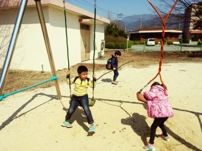 밥까지 떠 먹여 준 걸로 끝난 게 아니었군요. 자기가 타던 그네까지 떡하니 양보했네요. 그리고 자기는 기꺼이 주변에서 기다려 줍니다. 단짝 친구의 봉사를 받은 저 아이, 표정에서 뿌듯함이 가득하군요.
