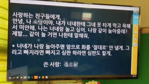 안녕, 나 효은이야. 내가 너네한테 그네 못 타게 막고 욕해서 미안해. 나는 너네랑 놀고 싶어. 나랑 같이 놀아줄래? 제발... 같이 놀 거면 나한테 말해줘.>