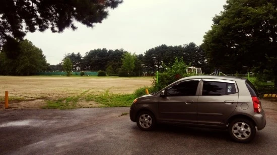 빗줄기가 가늘어지길래 운동장 가는 중간에 있는 주차장에는 흙이 없으니 굳이 바깥신으로 갈아 신지 않고 노는데