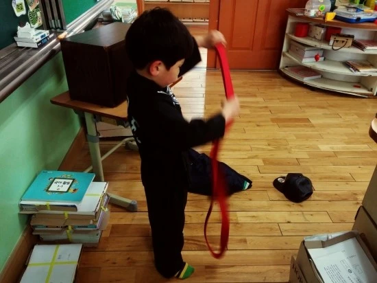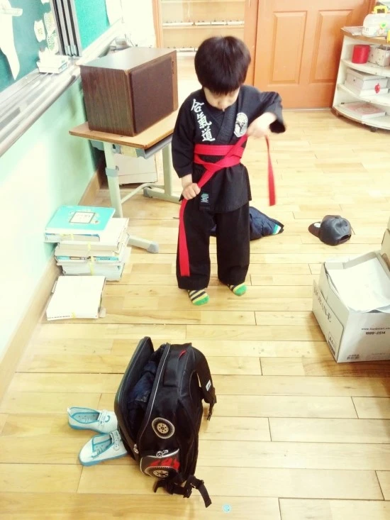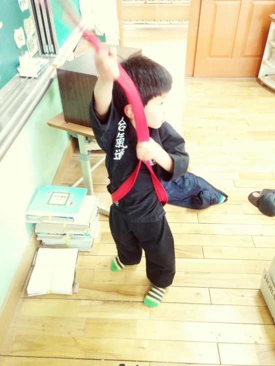한참 동안 시행착오를 하던 아이가 드디어 빨간 띠를 묶는다.