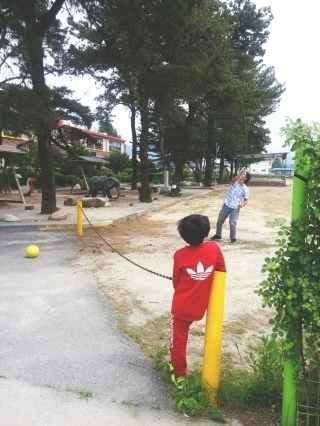 아이는 아빠로부터 적당히 떨어져 지켜본다. 무슨 응원이라도 하는지, 눈을 떼지 않는다.